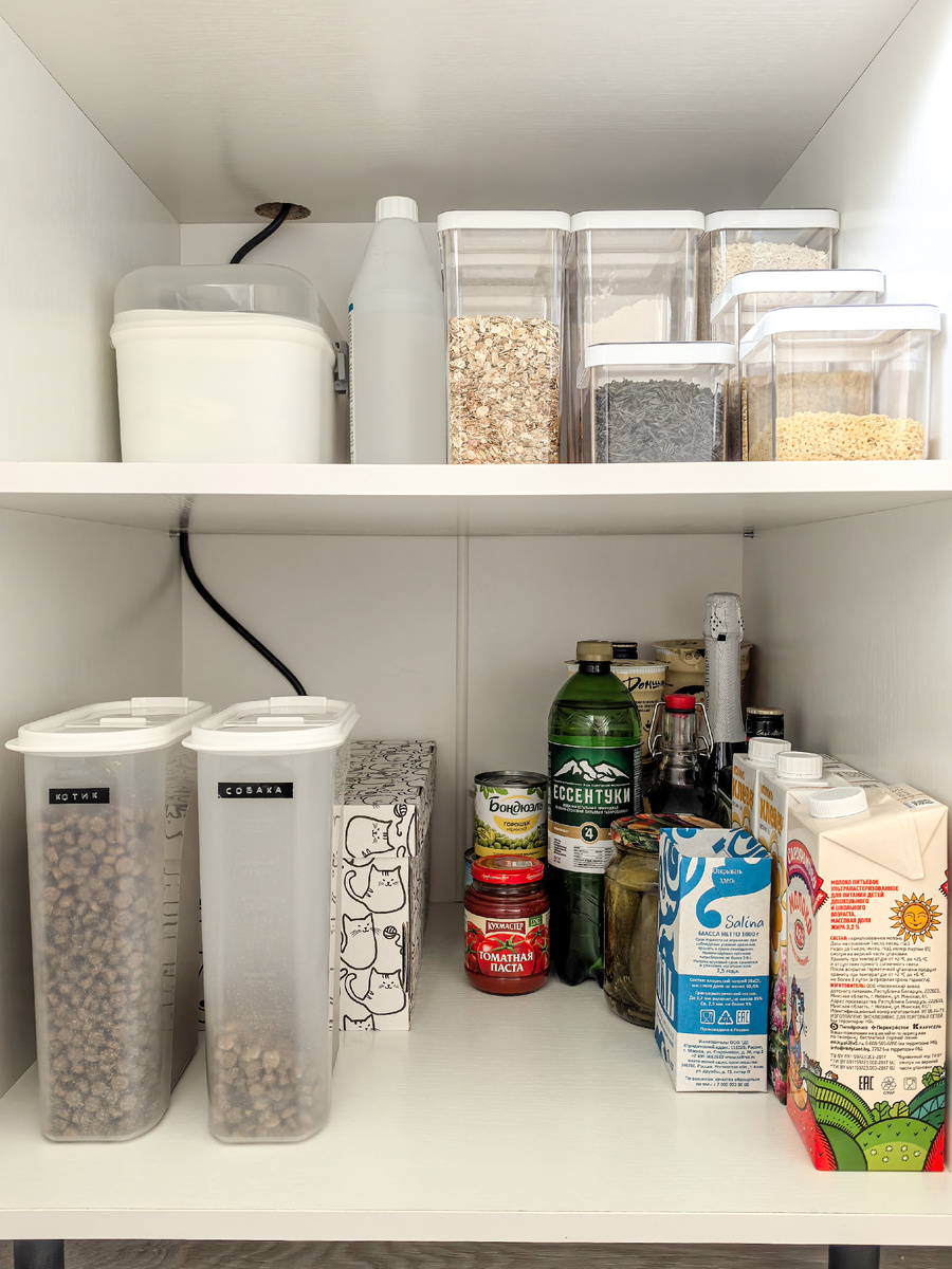 Продолжение статьи об организации и хранении на кухне. Начало можно почитать здесь: Итак, в предыдущей статье были вопросы о хранении сковородок и крышек, об организации кружек и тарелок и прочее. Поэтому решила показать всё подробно. Начну с полок, которые я не показала в первой части. Пенал со встроенной духовкой имеет два шкафа - сверху и снизу. В нижнем шкафу я храню крупы, корм для животных, некоторые запасы и консервы. Выглядят этот шкаф вот так: Сверху крупы в контейнерах, снизу корм, банки-склянки и короб с запасами. Запасов у меня немного, всё помещается в икеевскую картонную коробку. Там у меня соусы, макароны и лапша быстрого приготовления. Сверху над духовкой шкаф я частично уже показывала, сейчас покажу самую верхнюю полку и то, что стоит в корзине за тостером. На самом верху у нас стоят термосы и бутылки для воды, там же хранятся пустые банки и коробка с инструкциями и всякой всячиной. Конечно, коробка смотрится неэстетично, но она по длине и ширине просто идеально подо