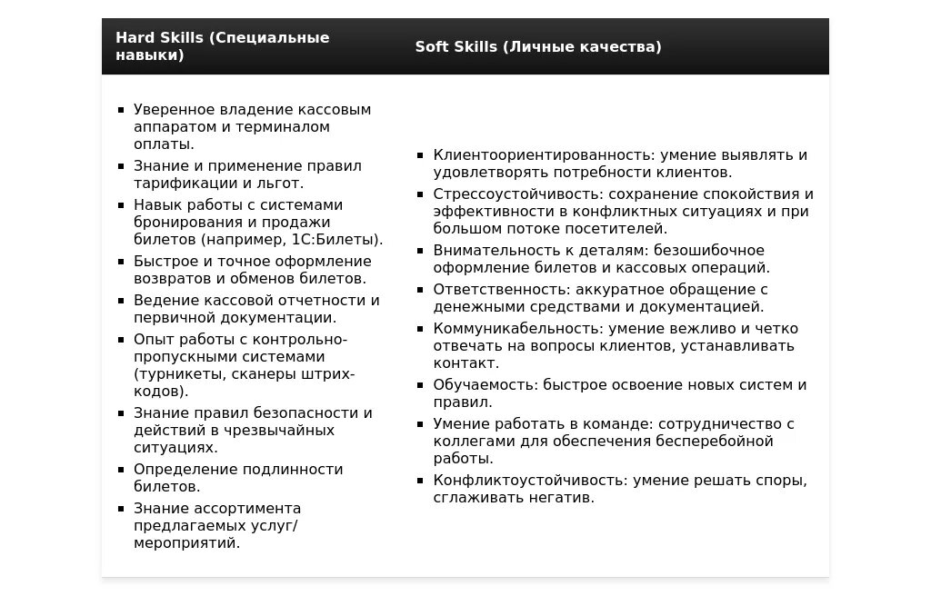 "Навыки: *Профессиональные навыки: работа с кассовым аппаратом (эксперт), продажа билетов (продвинутый). *Навыки работы с ПК: MS Office (продвинутый), знание билетных систем (базовый). *Личные качества: коммуникабельность, ответственность, внимательность к деталям, стрессоустойчивость."