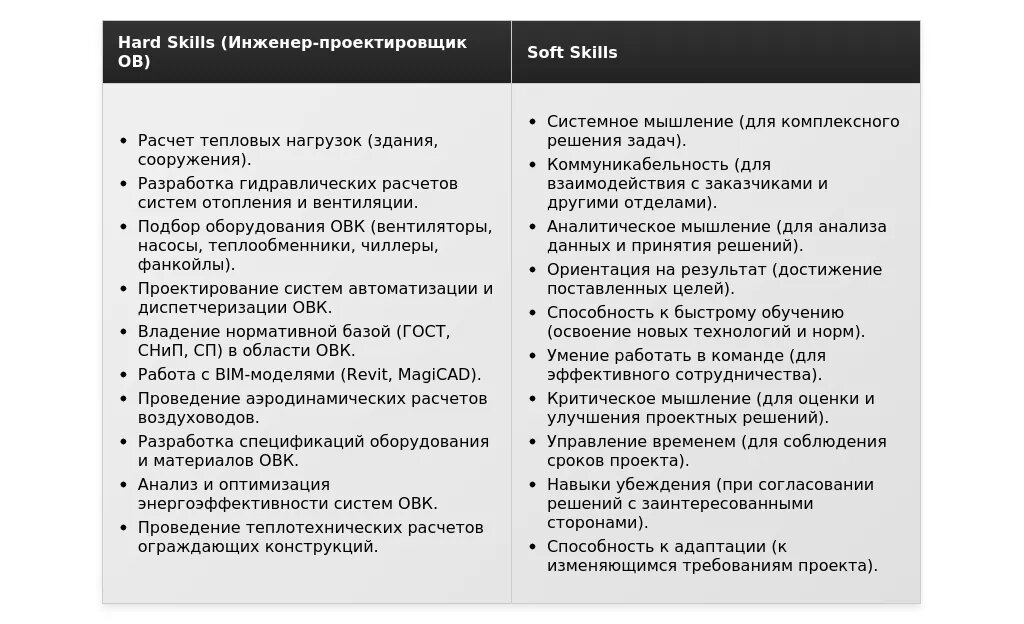 - Системы кондиционирования: "Подбор оборудования для систем кондиционирования", "Выполнение расчетов для систем кондиционирования", "Опыт работы с различными типами оборудования (VRF, чиллеры, фанкойлы)".