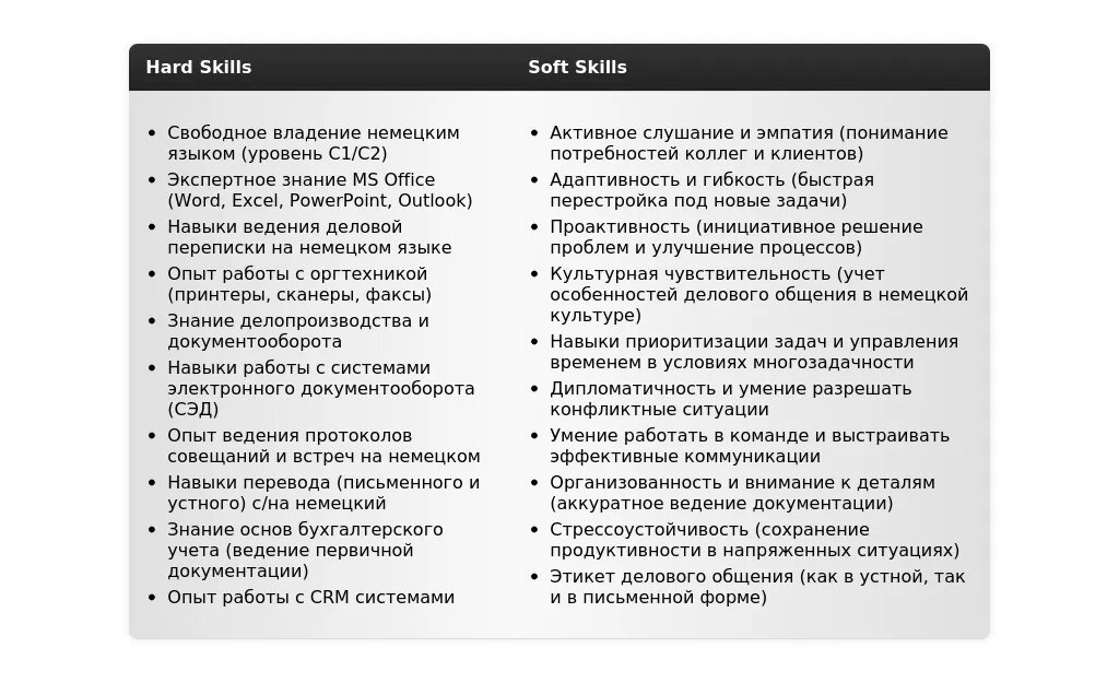 - На какие качества и навыки делать акцент: Владение немецким языком (укажите уровень), знание ПК (MS Office, программы для ведения делопроизводства), навыки делового общения, организованность, ответственность, внимательность к деталям.