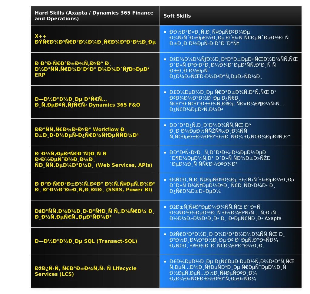 - На какие качества и навыки делать акцент: Знание X++, SQL, понимание принципов работы Dynamics 365 F&O, аналитические способности, умение решать задачи, обучаемость.