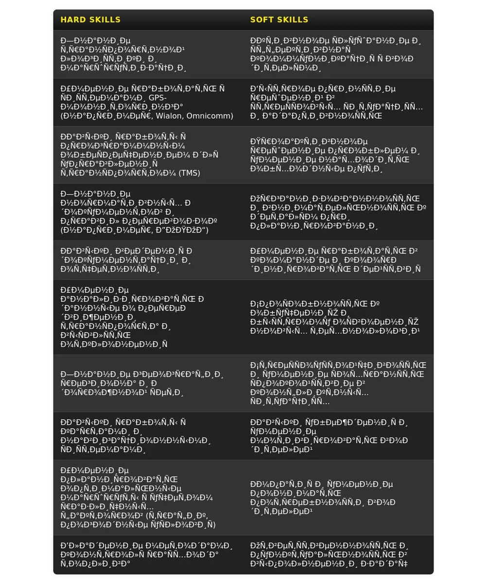- Как описать специализацию: Опишите, с какими видами транспорта и грузов вы работали, какие программы и технологии использовали.