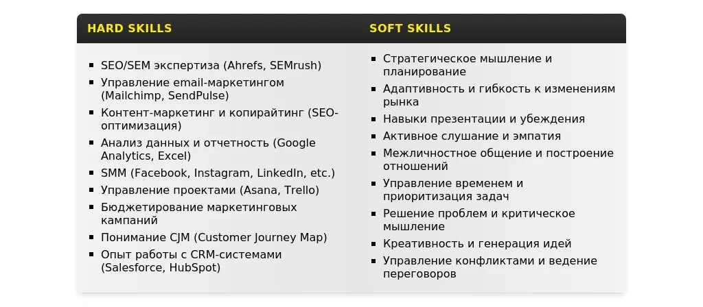- Разделите навыки на категории: Например, "Digital-маркетинг", "Аналитика", "Инструменты", "Soft Skills".