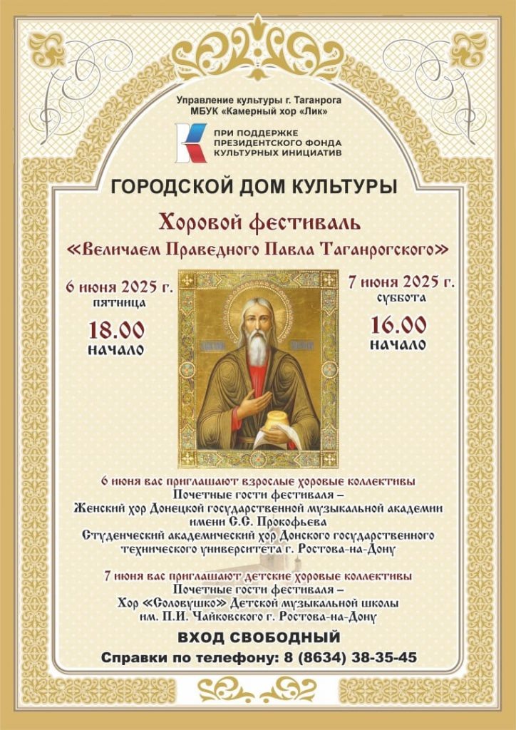 6 и 7 июня в ГДК Таганрога пройдет хоровой фестиваль, посвященный памяти святого Павла Таганрогского. Хоровой фестиваль «Величаем Праведного Павла Таганрогского», посвященный памяти святого покровителя Таганрога, впервые был проведен в нашем городе в 2020 году. Связанный с почитанием имени благочестивого старца, снискавшего неувядаемую славу своей постнической и молитвенной жизнью, фестиваль стал традиционным мероприятием, объединяющим многих любителей хорового искусства. В нынешнем году Хоровой фестиваль «Величаем Праведного Павла Таганрогского» пройдет в пятый раз и соберет лучшие творческие силы города и области: учебные и самодеятельные, детские и взрослые хоровые коллективы учреждений культуры Таганрога и Таганрогского благочиния. Впервые в рамках фестиваля выступят Женский хор Донецкой государственной музыкальной академии им. С.С. Прокофьева (ДНР), студенческий Академический хор Донского государственного технического университета (г. Ростов-на-Дону), Камерный хор «Соловушко» Детс