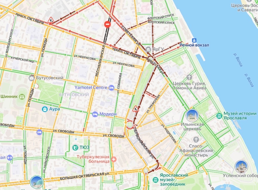 При движении в сторону Заволжского района. Утро четверга, 5 июня, немного удивило горожан. Обычно пробки на Московском проспекте и других городских магистралях возникают в часы пик, но сегодня все было иначе. Те, кто ехал на работу в районе 8 часов утра, добрались довольно спокойно, а вот дальше начались проблемы. Легкий затор наблюдается уже с моста через Которосль. После него, если взглянуть на карты, путь окрашен в бордовый цвет. Стоит улица Первомайская. Да, в районе театра имени Волкова проводятся какие-то работы, но вряд ли они являются причиной пробки, ведь и дальше транспорт движется еле-еле. Некоторые автобусы высаживают пассажиров, не доезжая до Красной площади. Еще бы, пешком в данной ситуации дойти гораздо быстрее. Стоит и сама Красная площадь, и улицы Советская и Терешковой, и проспект Октября. Связана ли эта ситуация с недавним перекрытием участка улицы Республиканской, пока непонятно. Но проблемы с движением в районе проведения работ были и накануне.