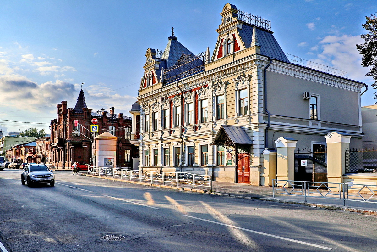 Напротив дома Линева-Разина — элегантный особняк. Это бывший торгово-промышленный банк (Пионерская, 48). Здание было построено в конце XIX века. Владельцем был купец Кожевников. В 1880-х он продал его другому купцу — Николаю Дунаеву, а тот в 1896 году передал дом Русскому Торгово-Промышленному коммерческому банку. Тогда здание и приобрело свой нынешний облик.