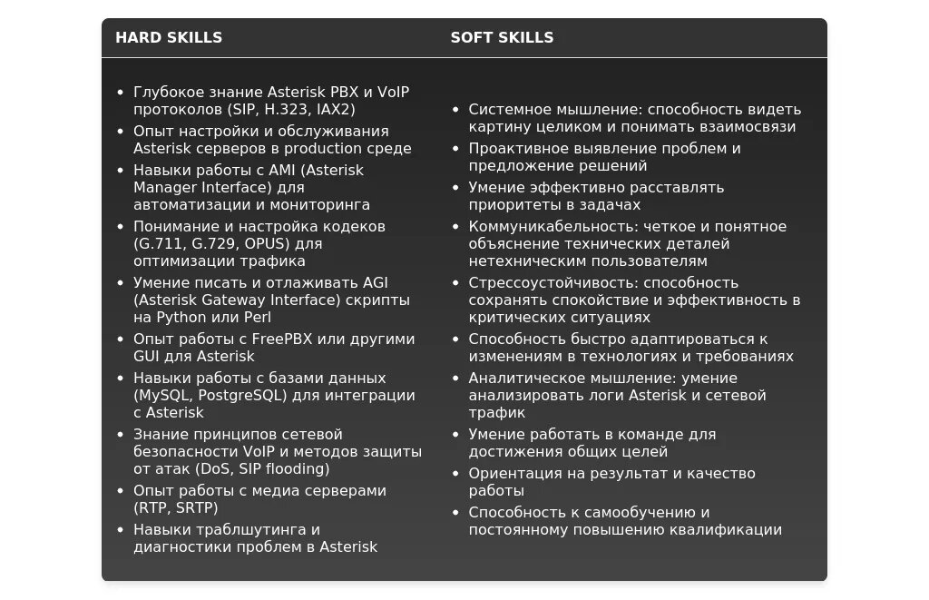 Разбор: Слишком общие фразы, нет конкретики по навыкам и знаниям в области Asterisk.