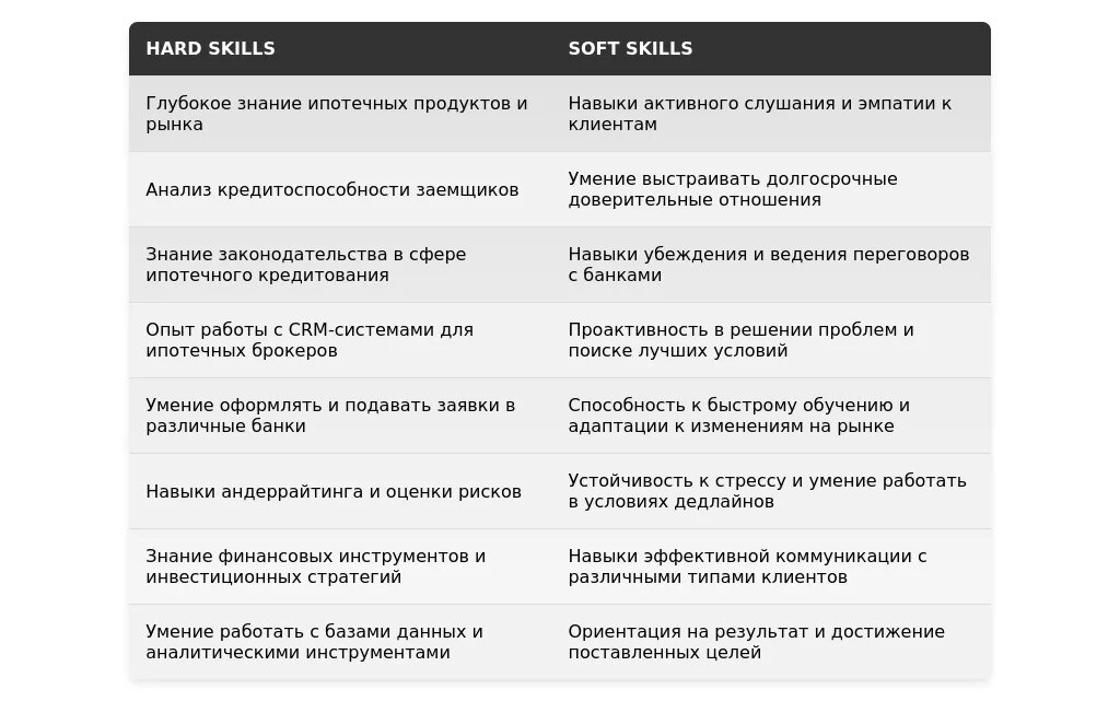 Ключевые навыки, релевантные для позиции ипотечного брокера (например, умение вести переговоры, знание ипотечных продуктов, опыт работы с клиентами).