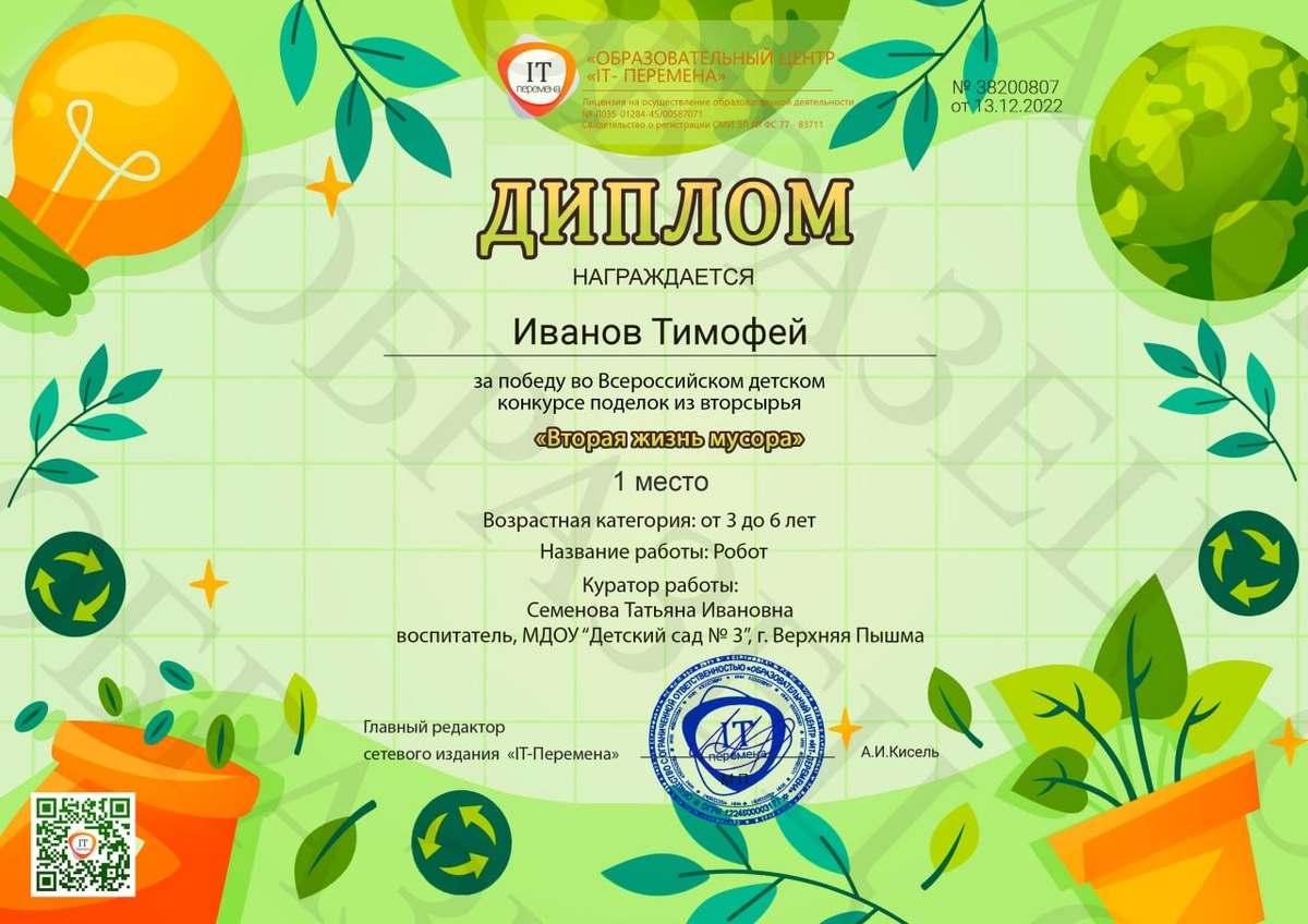 Мы подвели итоги бесплатного Всероссийского детского конкурса поделок из вторсырья "Вторая жизнь мусора"! Результаты и наградные документы уже размещены в нашем новом поисковом телеграм-боте "Переменка": https://t.me/itperemenka_bot На сайте на странице результатов итоги будут опубликованы 9 июня в 8:00 по МСК. Заказать оригиналы наградных документов, напечатанных в высоком качестве на плотной бумаге, можно под соответствующим дипломом.