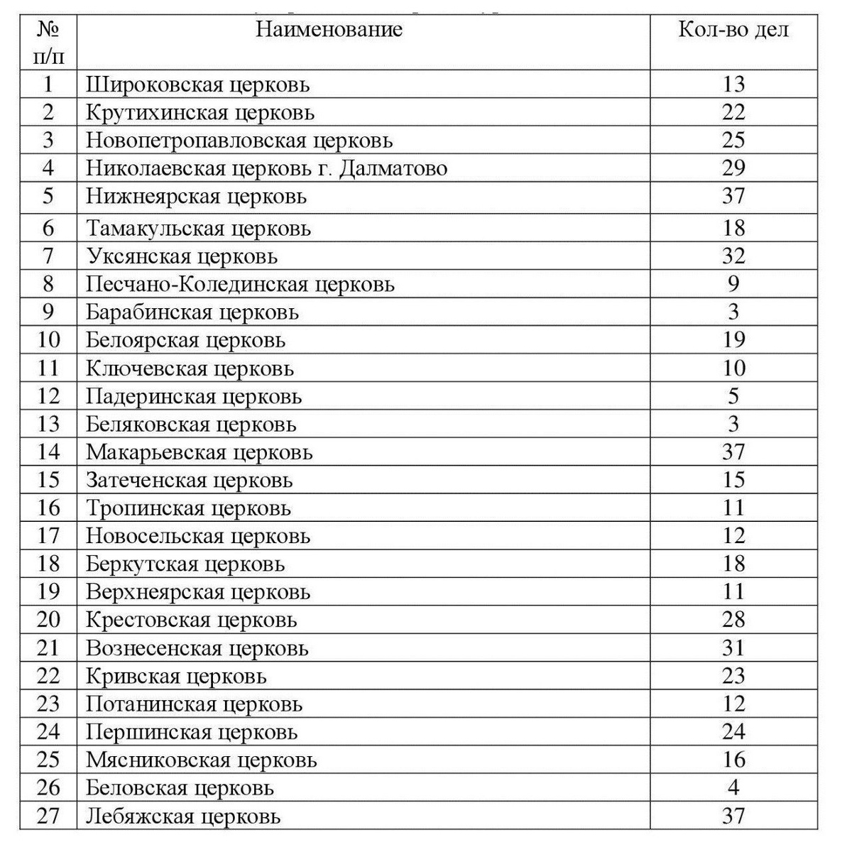 Может быть, кому-то понадобятся, и пусть хранится здесь эта информация. После того, как записалась в государственный архив Курганской области для подачи заявок-требований на выдачу источников, и после того, как прибыла в читальный зал для работы с ними (прилагаю список): Мню были заявлены к просмотру 74 дела по следующим церквям (выдано 6): - Николаевская церковь г.Далматово (полностью вся в работе, дел выдано из 29 - 0) - Песчано-Колединская церквоь (полностью вся в работе, дел выдано из 9 - 0) - Ключевская церковь (полностью вся в работе, дел выдано из 10 - 0) - Затеченская церковь (из 15 выдано 4 дела; просмотрены полностью все 4 за 3 часа) - Верхнеярская церковь (из 11 дел выдано 2. Именно эти 2 дела достаточно большие 2 источника, с частым написанием писчика, и мелким почерком. Преобладающая часть фамилий: Брызгалов и Вершинин, встречаются и другие: Полухин, Поспелов, но мне нужны были в основном другие, поэтому особенно тщательно не смотрела) - Першинская церковь (не заявл