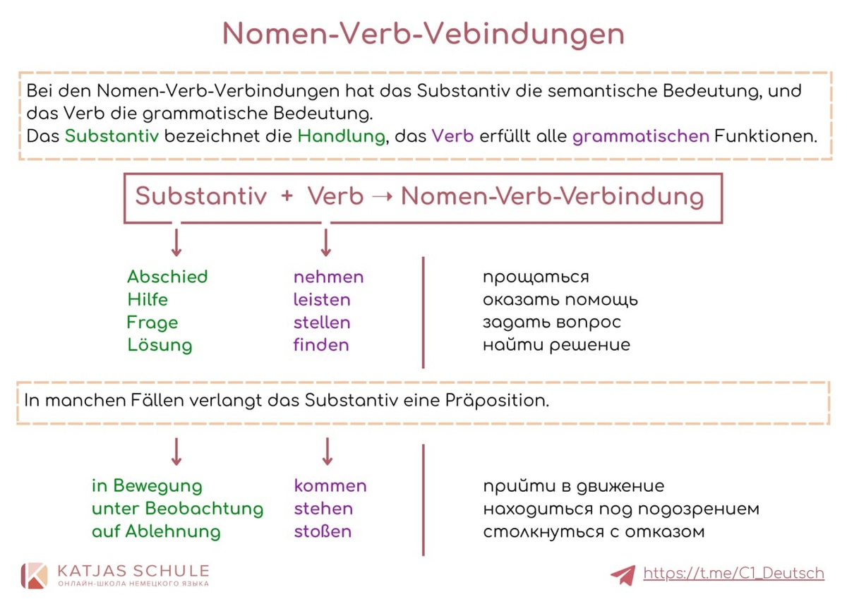 У меня есть Nomen 🖊, у меня есть Verb 🍎 ... Оп – и у меня Nomen-Verb-Verbindung 🍍! А как они склеились и какие сочетания будут Nomen-Verb-Verbindung'ом, а какие нет? 1⃣ Во-первых, идиоматичность. Nomen в этом сочетании отвечает за смысл, а Verb – за то, чтобы грамматически встроить Nomen в предложение. Если убрать один из элементов, всё рассыплется! ➡ Например, возьмём zur Verfügung stehen (быть в наличии/распоряжении). Uns stehen über 1000 Parkplätze zur Verfügung. – У нас в распоряжении есть более 1000 парковочных мест. Уберём или заменим на что-то другое глагол – существительное не сможет встроиться в предложение. Уберём существительное – получим Uns stehen über 1000 Parkplätze. Куда они, чего они stehen? 2️⃣ Во-вторых, стилистика. Для большинства Nomen-Verb-Verbindungen характерен формальный, официальный стиль речи. Не для всех, но для многих. Сравним глагол entscheiden и сочетание Entscheidung treffen: 👨🏻💼 – So! Wie geht es dem Markus? Hat er schon entschieden, was die