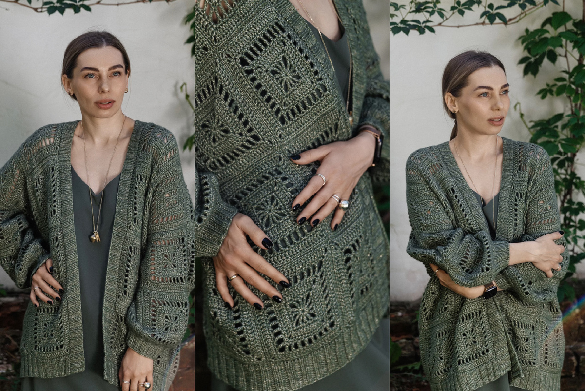 Приглашаем всех желающих принять участие в нашем бесплатном совместнике по вязанию кардигана крючком из мотивов - #aura_kvadro_cardi. Совместник - это совместное вязание изделия группой вместе с куратором. Он подойдет как опытным, так и начинающим рукодельницам. Всем, кто хочет связать стильный кардиган. Совместник будет проходить в закрытом Телеграм-канале. Участие БЕСПЛАТНОЕ. Главное условие - вяжем только из пряжи Aura Yarns. Каждый этап вязания кардигана будет сопровождаться подробным видео. Cтарт 10 июня, но вступить в группу совместника можно до 25 июня включительно. #aura_kvadro_cardi - это кардиган крючком из мотивов (всего 44). Сначала отвязываются все мотивы, соединяются в полотно. Затем вяжется планка и резинка на рукавах. В совместнике будут даны расчеты на один универсальный размер - на обхват изделия 135 см. Оригинальные кардиганы связаны из пряжи с люрексом - Fashion Shiny Day. Светлый в оттенке Cream, зеленый в оттенке Eucalyptus. Расход пряжи — 13 мотков. В основе эт