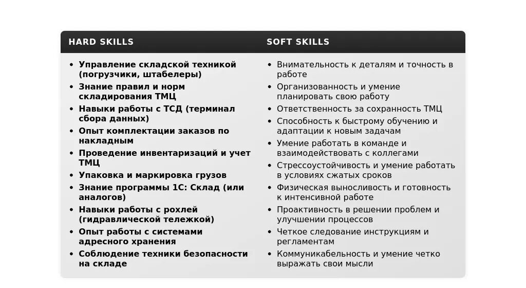 - Добавьте специфические навыки: Укажите конкретные навыки, которые требуются в вакансии (например, знание определенной программы складского учета, опыт работы с конкретным типом оборудования).