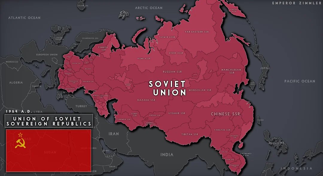 Туда входит весь европейский соцблок, туда входит Финляндия, туда входит весь Китай, туда входят страны Индокитая - Вьетнам, Лаос, Камбоджа. Причем Китай разделен на несколько союзных республик - Уйгурскую, Тибетскую, Маньчжурскую и т.д.