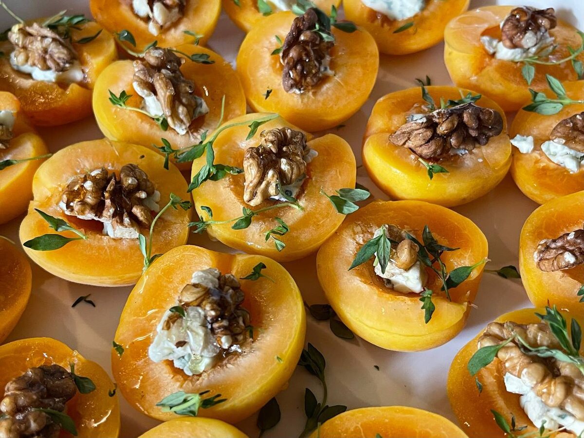 Лето! Ах лето! Всё созревает, наливается спелостью и в стремительном круговороте сменяет друг-друга. Только, недавна была Клубника, а уже малина-смородина. За черешней пришли вишня и абрикосы. Впереди персики, яблоки и арбузы. Надеюсь, Вы обратили внимание, что на нашем с Вами канале мы уделяем внимание сезонности и пытаемся охватить природное многообразие с кулинарной точки зрения. Абрикосы ДорБлю с хрустящими орешками и лавандовым мёдом Ингредиенты 1️⃣ Абрикосы - 10 шт 2️⃣ Сыр ДорБлю - 40 - 50 гр 3️⃣ Грецкий орех - 5 шт (20 четвертинок) 4️⃣ тимьян - 4-5 веточек 5️⃣ Лавандовый мёд (рецепт) - 2 ст.л Мёд можно и обычный, но, лавандовый интереснее вписывается в наш нотный ряд, тем более, что приготовить его - 10-15 минут. Способ приготовления Абрикосы моем, разрезаем пополам, удаляем косточку и место крепления черенка. Выкладываем в форму для запекания. В центр кладём маленький кусочек сыра с благородной голубой плесенью (ДорБлю). Буквально 2-3 грамма на одну половинку. Сверху вык