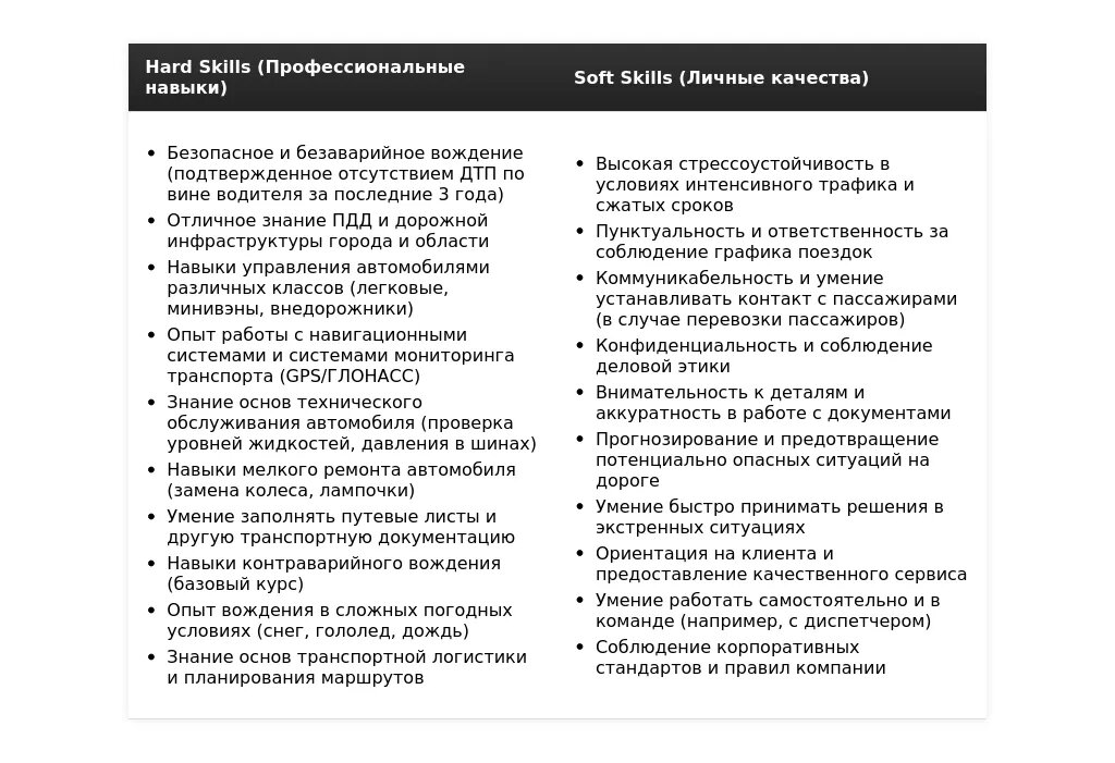Ключевые навыки, релевантные для вакансии (например, безаварийное вождение, знание ПДД, опыт обслуживания автомобиля).