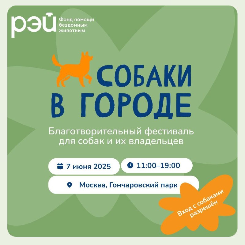 Фестиваль «Собаки в городе» совсем скоро 🐶 7 июня в Москве в Гончаровском парке пройдётблаготворительный фестиваль «Собаки в городе», который организуют наши друзья – благотворительный фонд «РЭЙ»! Это праздник для всех любителей собак, куда можно и нужно приходить не только всей семьёй, но и вместе с питомцами. А если у вас дома ещё нет верного друга, на фестивале вы сможете познакомиться с 50 собаками из московских приютов, которые мечтают встретить своего любящего хозяина! Также на фестивале: ✦ интересные лекции от зоопсихологов и ветеринарных врачей; ✦ танцы с собаками, фрисби-шоу и ноузворк; ✦ увлекательные мастер-классы для взрослых и детей; ✦ атмосферный благотворительный маркет с авторскими работами; ✦ викторины, конкурсы и бесплатная лотерея с классными призами. Когда: 7 июня с 11:00 до 19:00 Где: г. Москва, Гончаровский парк (м. Бутырская/Дмитровская) Все подробности и новости фестиваля:dogs.rayfund.ru #Собакивгороде2025