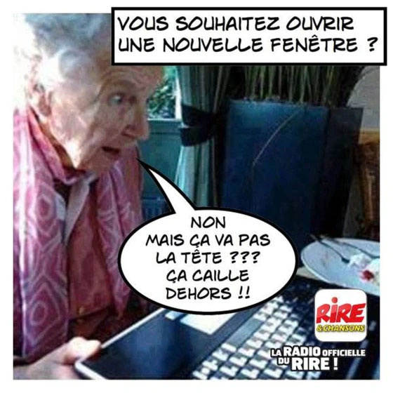 Бабушка общается с компьютером. Как-никак, 21-й век на дворе. Ну а мы запомним парочку забавных и полезных фраз. Ça va pas la tête? - Вы в своем уме? (Вариант - "Вы что, из ума выжили?") Ça caille dehors! - На улице такая холодрыга! Заметьте, французы не говорят "на улице", а говорят "снаружи".