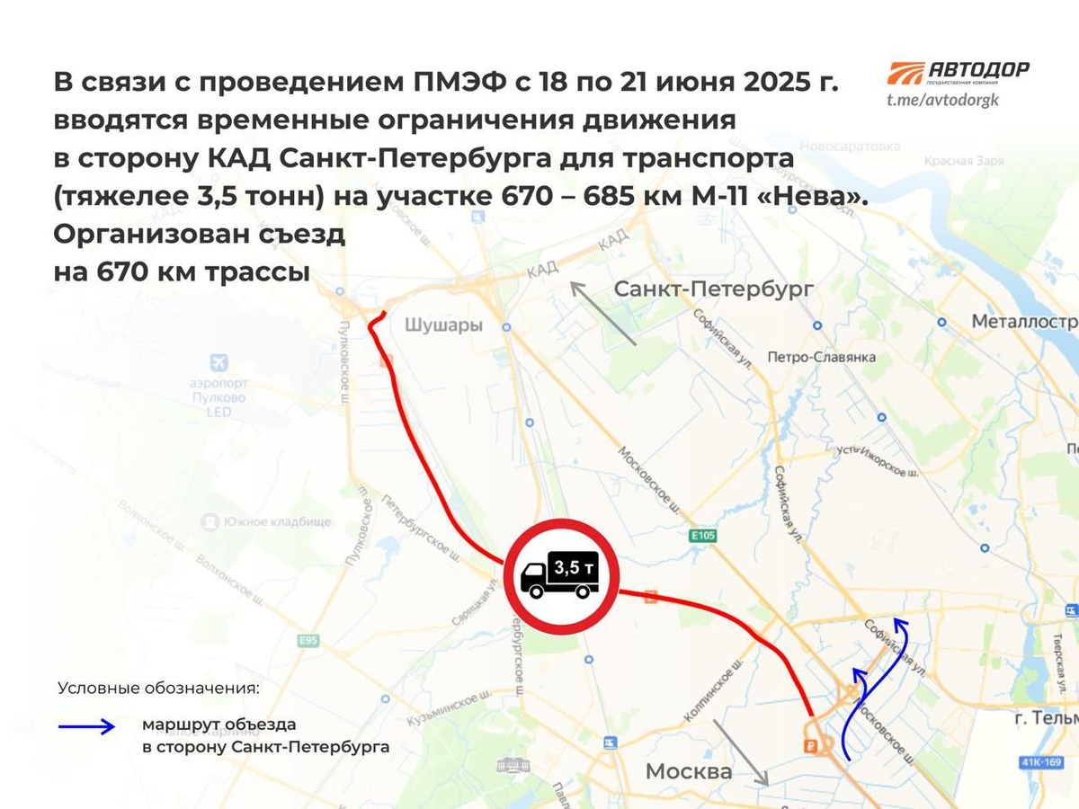 На период проведения ПМЭФ с 18 по 21 июня на участке М-11 «Нева» от развязки с Софийской улицей до КАД (670 — 685 км) будет временно запрещено движение грузовых автомобилей массой более 3,5 тонн.