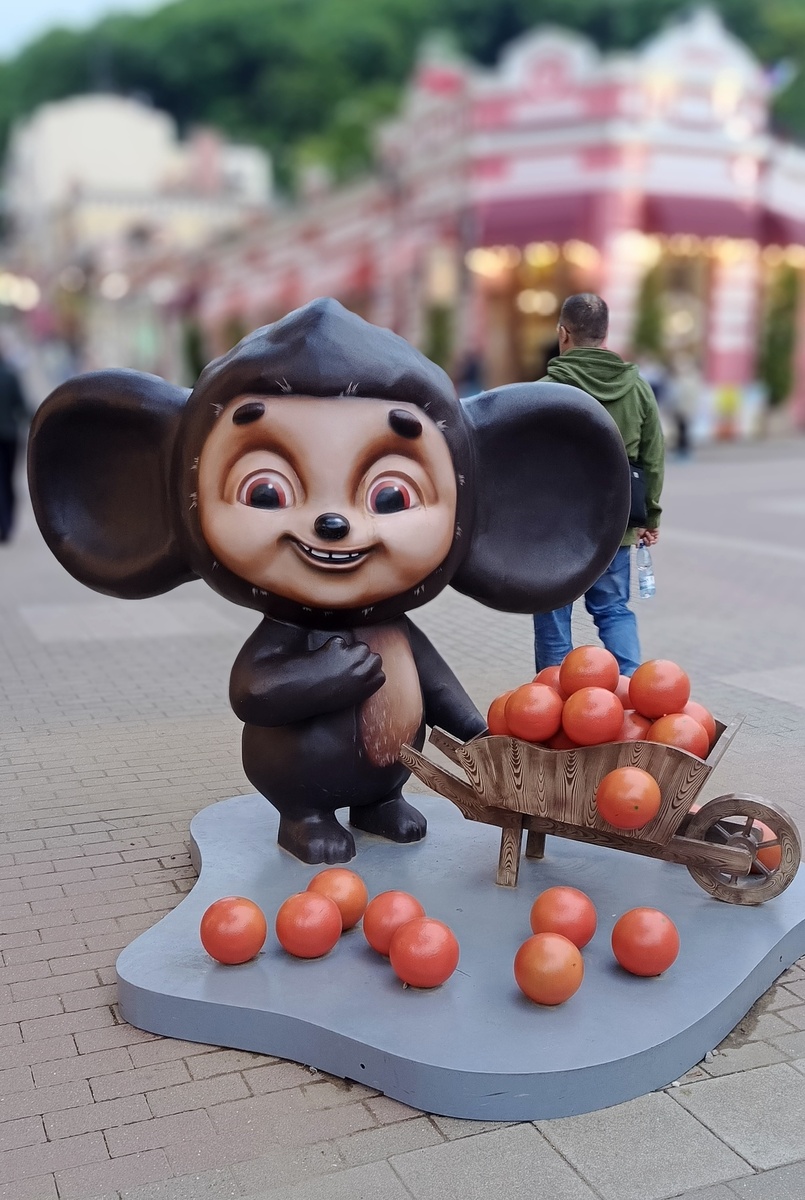 Милый Чебурашка, новый символ города, его можно встретить в разных местах, и он такой классный, наш любимый с детства зверек, несмотря на убогий фильм. Тут везде будет поджидать и играть с детками, они прям готовы его с собой забрать, настолько хорош.