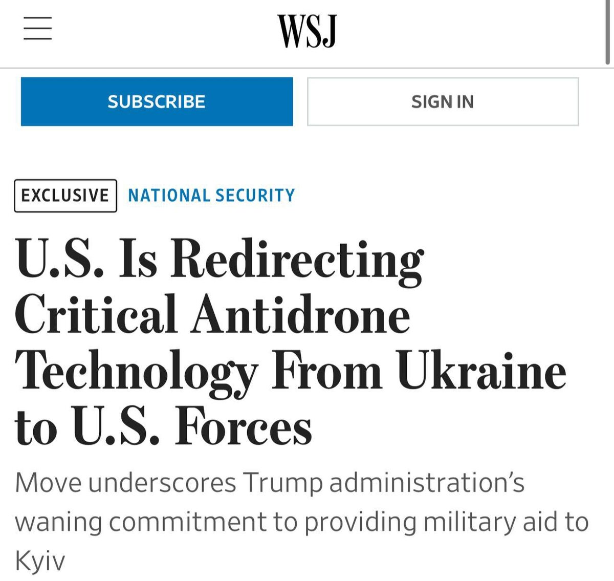 Администрация Трампа лишает Украину «критической технологии» для борьбы с беспилотниками, — сообщает Wall Street Journal.