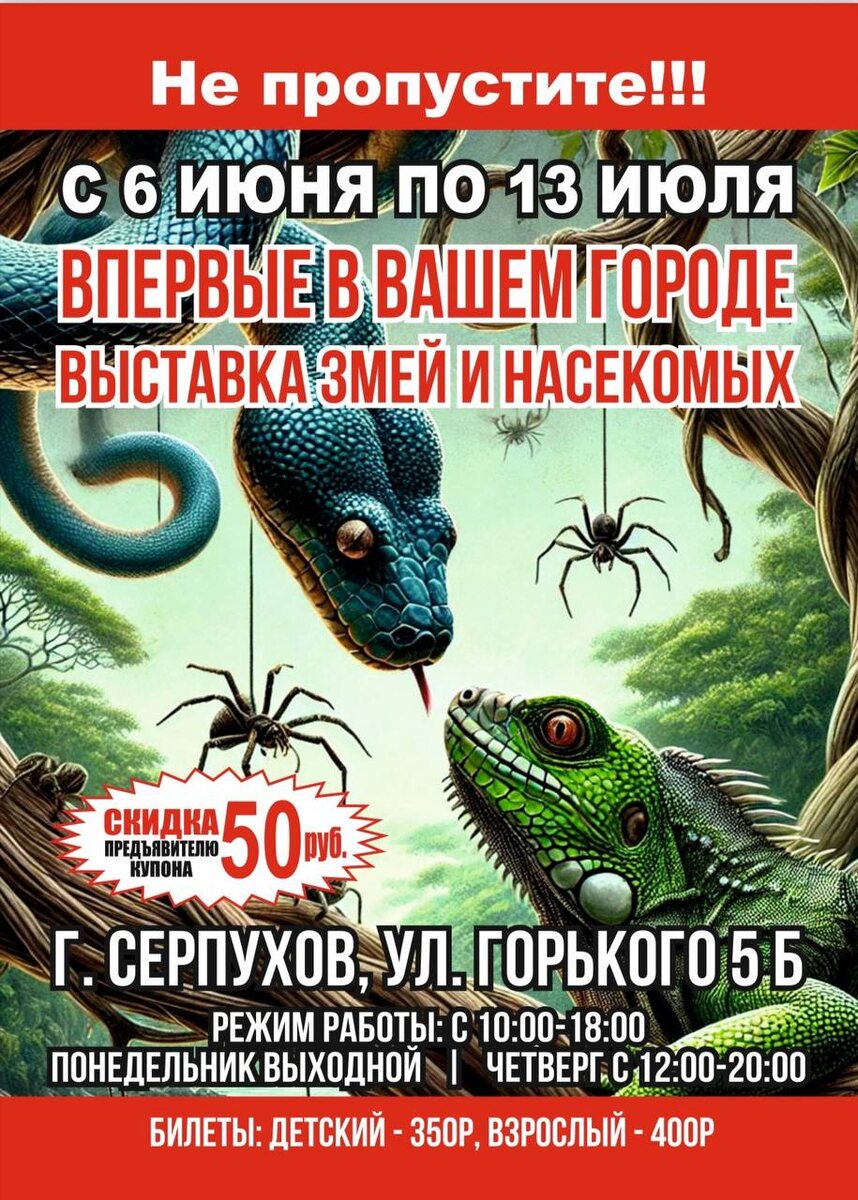 Розыгрыш 30 билетов на выставку "ИНСТИНКТ ХИЩНИКА, СЕРПУХОВ встречай👋 С 6 июня по 13 июля (включительно) Музейно- Выставочный центр ОБНОВЛЕННАЯ ВЫСТАВКА ВОЗВРАЩАЕТСЯ В СЕРПУХОВ 🦎🐍🕷️🦂 ВСЕ ДЕЙСТВИЯ ВЫПОЛНЯЮТСЯ НА СТРАНИЦЕ ОГРАНИЗАТОРА vk.com/club218902598 🤩Условия розыгрыша: ✅ Быть подписанным на Инстинкт Хищника ✅ Сделать репост розыгрыша к себе на страницу ✅ Поставить лайк розыгрышу и предыдущим двум постам на странице Инстинкт Хищника ✅ Написать комментарий с кем вы пойдёте, если выиграете 🤩Результаты - 27 июня 🎫 30 победителей получат (Билет на двоих) СКИДКА 50₽ участникам! За подписку на Инстинкт Хищника и репост розыгрыша. Покажите на кассе и получите скидку🎁