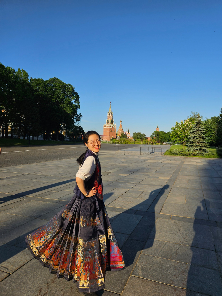 🌸Недавно многие из вас заметили мой наряд, когда я ходила в Кремлёвский концертный зал на спектакль «Поэтический танец». Сегодня давайте познакомимся с 马面裙 (mǎmiànqún, "юбка с лошадиной мордой") — одной из самых поэтичных форм традиционной китайской одежды. 🤔Что такое 马面裙 (mǎmiànqún)? В переводе с китайского это значит «юбка с лошадиной мордой». Странное название, правда? 😊 На самом деле оно связано не с животным, а с архитектурой. Форма передней и задней частей юбки напоминает элементы древней китайской крепостной стены — так называемые 马面 (mǎ miàn, «лошадиная морда»), прямоугольные выступы в конструкции оборонительных ворот. Юбка 马面裙 выглядит многослойной, но на самом деле — это цельное полотнище ткани, разрезанное на две перекрывающиеся секции спереди и сзади. Когда её раскрываешь — видно, что она представляет собой один плоский отрез, похожий на свиток. Спереди и сзади находятся так называемые 裙门 (qúnmén — "ворота юбки"). Они перекрываются и образуют прямые панели — отсюда и в