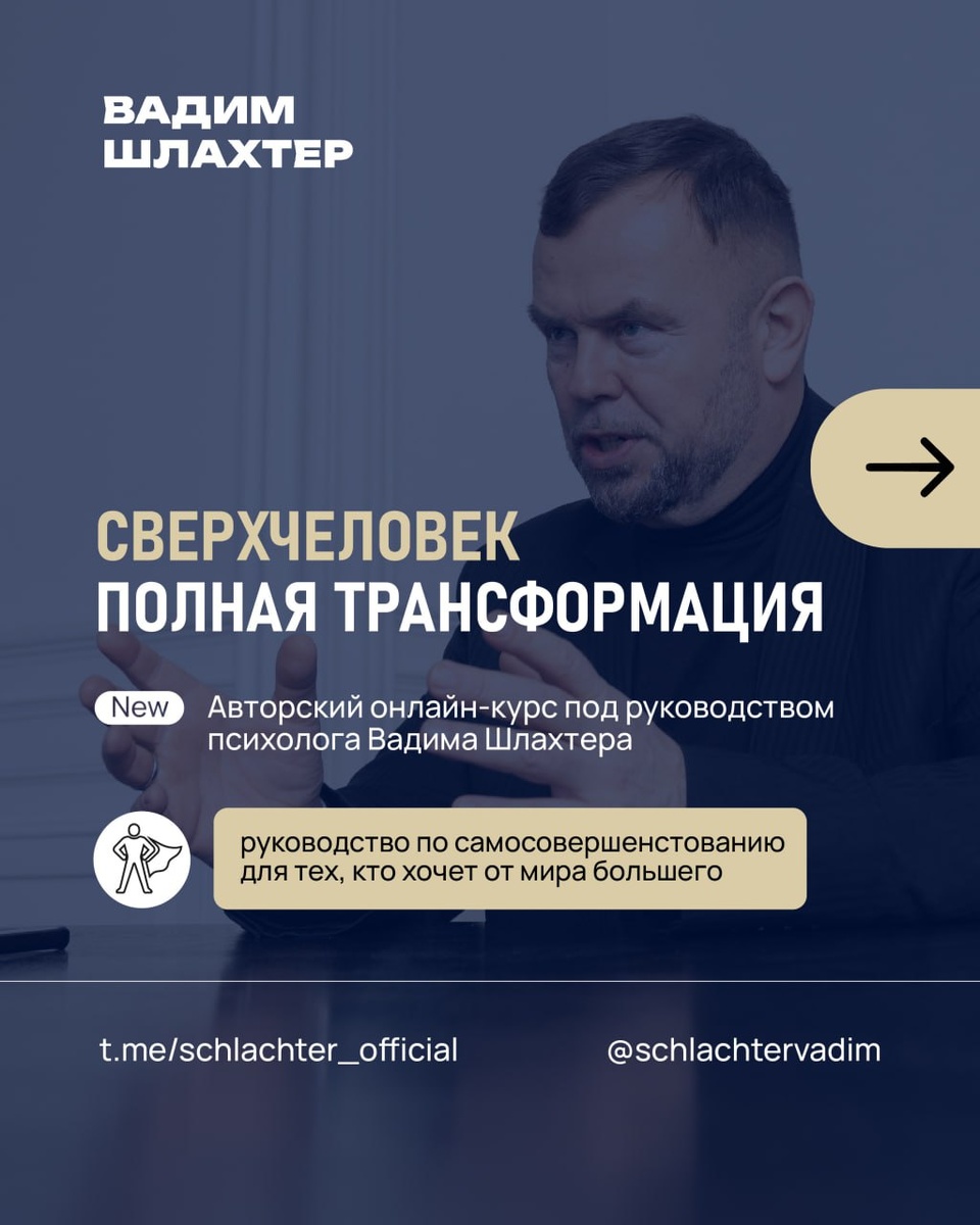 Друзья, приглашаю на мой авторский онлайн-курс: «СВЕРХЧЕЛОВЕК. Полная трансформация» 🔽 Старт — 25 июня в 20:00. Продолжительность — 2 недели. 👍 На курсе ты узнаешь, как: – тотально изменить свою жизнь; – достичь того, о чем раньше даже не думал; – сохранять устойчивость в условиях стресса, – притягивать правильных людей в свою жизнь, – запускать процессы самоисцеления и восстанавливать свою энергию. ✈️ Новая программа под моим руководством — 6 часовых занятий через день + постоянное сопровождение + постоянный доступ к записям. 👤 Пиши мне лично @schlachter, дам подробную информацию об обучении. Только для подписчиков платного канала даю промокод «КОД50» – скидка 50%.