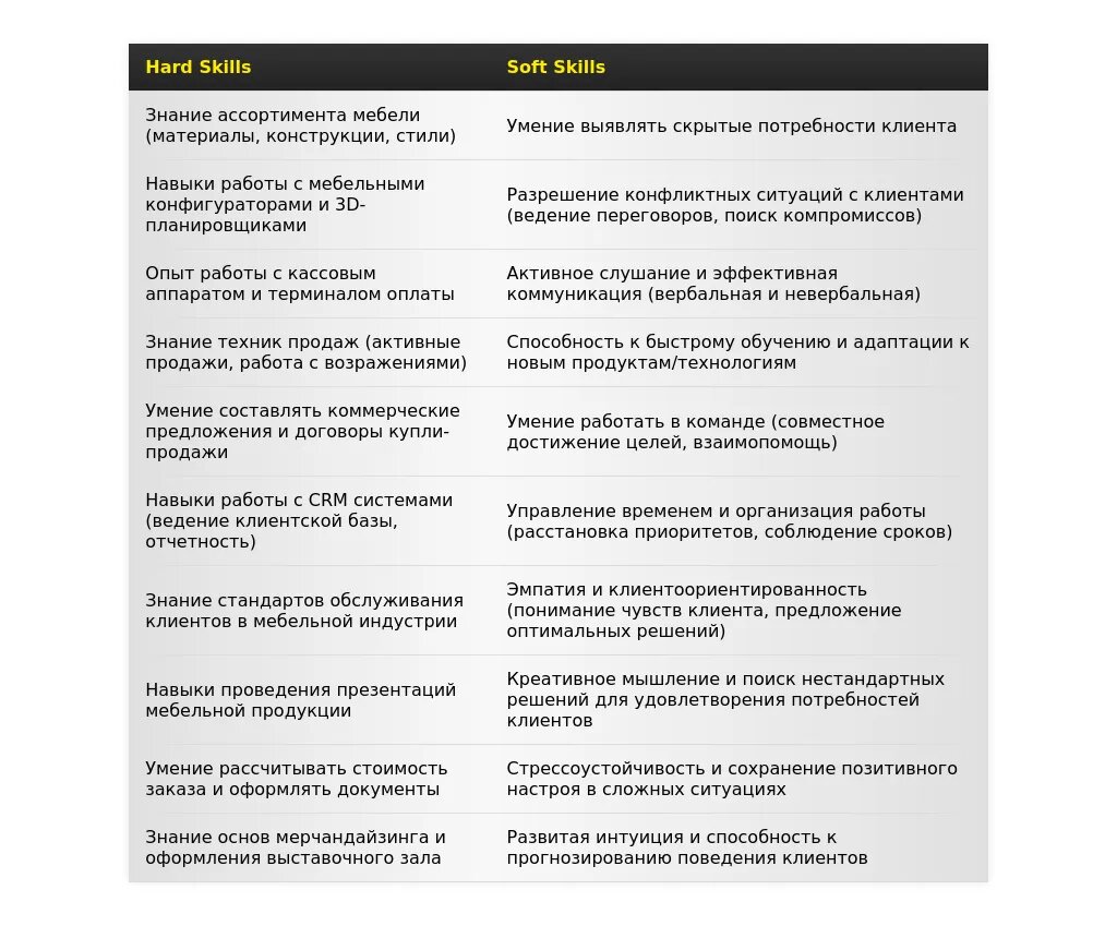 - Менеджер-консультант: "консультирование клиентов", "подбор мебели", "работа с возражениями", "знание основ дизайна".