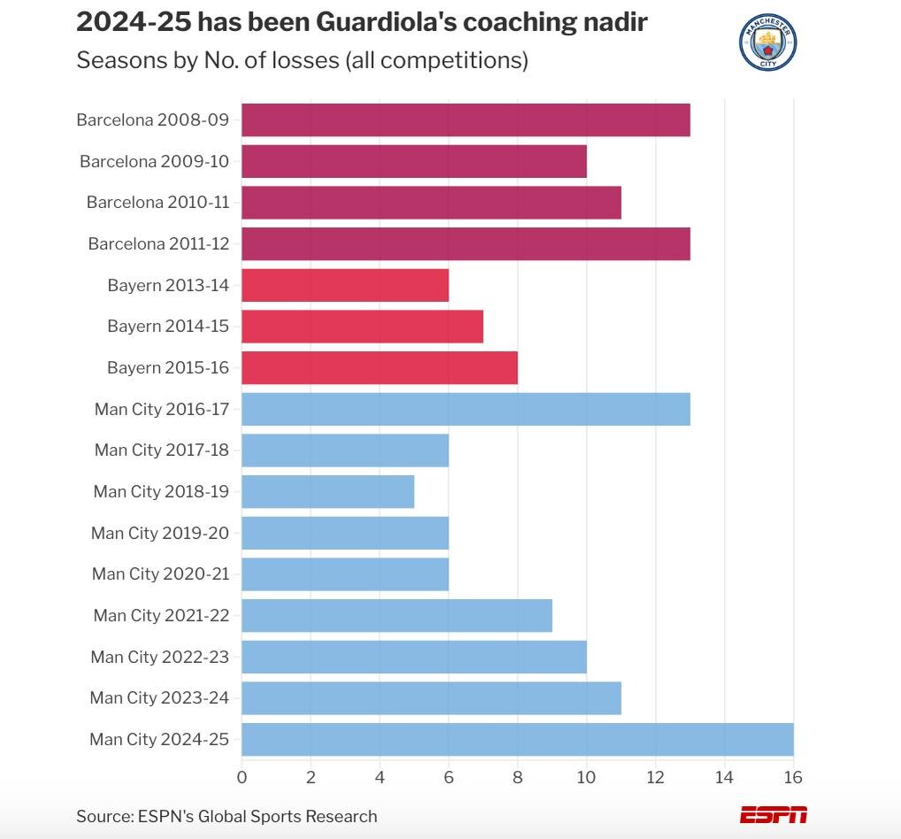 Количество поражений в тренерской карьере Пепа Гвардиолы по сезонам 📊