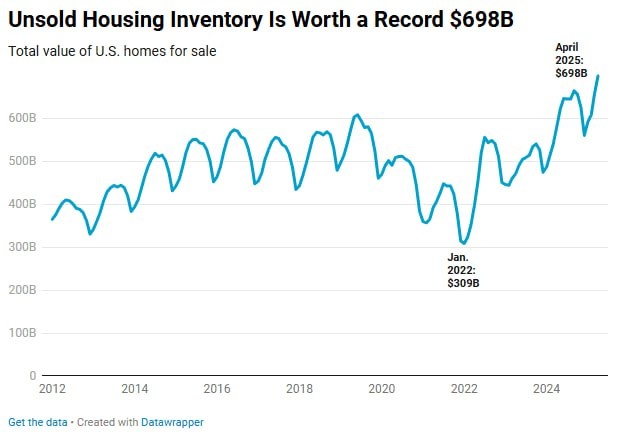 В ответ на пост Рынок жилья, к счастью, не собирается обваливаться? Так ведь? https://www.redfin.com/news/record-dollar-value-home-listings/ «Объявления на сумму более $330 млрд находятся на рынке уже 60 дней и дольше. Общая стоимость выставленных на продажу домов в США составляет $698 млрд, что на 20,3% больше, чем годом ранее, и является самой высокой суммой в истории. Растущий запас и медленный спрос на жилье приводят к росту общей суммы предложений жилья в долларах и приведут к снижению цен на жилье к концу года». @marketheart