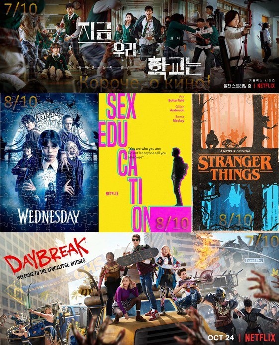 Сериалы про подростков в необычных обстоятельствах 1. Уэнсдей/Wednesday 2022-... Моя оценка: 8 из 10 Оценка на КП/IMDb: 7,9/8,0 О чём: Уэнсдей Аддамс поступает в академию Невермор и раскрывает мрачную тайну, связанную с её семьёй и чередой убийств. 2. Половое воспитание/Sex Education 2019–2023 Моя оценка: 8 из 10 Оценка на КП/IMDb: 8,0/8,2 О чём: Неуклюжий подросток с мамой-сексологом начинает давать одноклассникам советы по интимным вопросам. Весело, смело и по делу. 3. Очень странные дела/Stranger Things 2016–... Моя оценка: 8 из 10 Оценка на КП/IMDb: 8,4/8,6 О чём: Пропажа мальчика в маленьком городе оборачивается встречей с параллельным миром, монстрами и девочкой со сверхспособностями. 4. Мы все мертвы/Jigeum uri hakgyoneun 2022– Моя оценка: 7 из 10 Оценка на КП/IMDb: 7,1/7,6 О чём: Корейская школа становится эпицентром зомби-апокалипсиса. Подростки пытаются выжить, когда спасения ждать неоткуда. 5. Рассвет апокалипсиса/Daybreak 2019 Моя оценка: 7 из 10 Оценка на КП/IMDb: 6,2