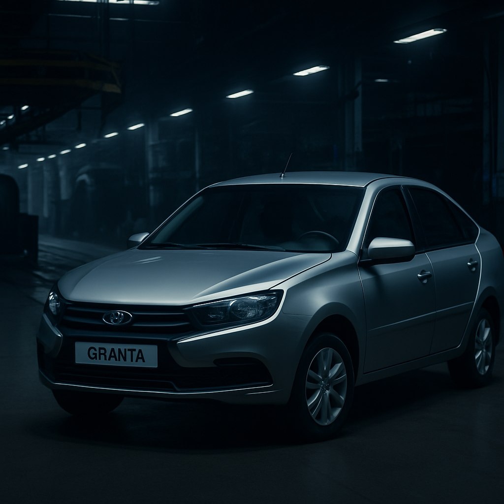 **Main idea**: Темпы локализации автопрома в России значительно отстают от ожидаемых показателей, что создает вызовы не только для автомобильной отрасли, но и для промышленной политики в целом. **Visual metaphor**: Автомобиль выглядит застигнутым в момент ожидания, символизируя замедление и стагнацию, а его окружение подчеркивает серьезность ситуации. **Image prompt**: A cinematic hyper-realistic 16:9 image of an editorial photograph from an automobile magazine, representing the challenges of localization in the Russian auto industry - the vehicle, a sleek and modern AvtoVAZ Granta, is clearly visible, beautifully lit against a backdrop of a dimly lit factory setting, where shadows loom over the assembly line. The atmosphere is tense and introspective, evoking a sense of urgency and reflection. Use realistic lighting: the sterile glow of overhead factory lights combined with the dull blues and greys of machinery, in keeping with the tone of the news. Artistic realism, ultra-HD, 1