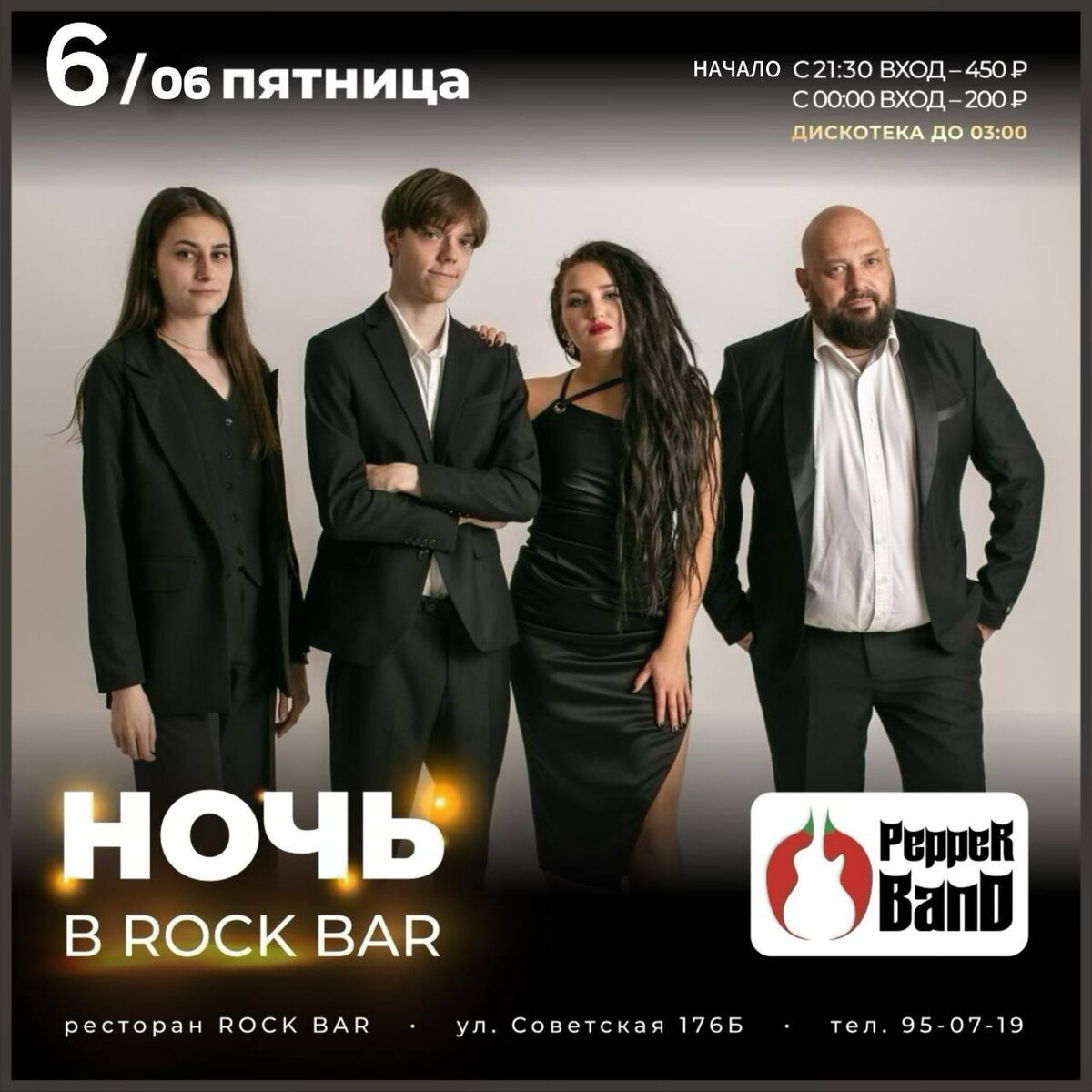 6 ИЮНЯ ПТ. "НОЧЬ В ROCK BAR” ГРУППА PEPPER BAND & ДИСКОТЕКА В эту пятницу будет однозначно зажигательно со вкусом, ведь на сцене группа PEPPER BAND, а в продолжении концерта - дискотека из хитов всех стилей и времён! Вход 500₽, с 00:00 - 250₽ ✅ Уважаемые гости! Пожалуйста, если Вы опаздываете, позвоните или напишите нам, при опоздании более 15 минут без предупреждения бронь снимается. АС 18+ FC/DC Данная публикация носит исключительно информационный характер. 📞INFO/RV (с 15:00) +7-9148-95-07-19 💻 INFO/RV: www.rockbar38.ru 📍г.Иркутск, ул. Советская 176Б