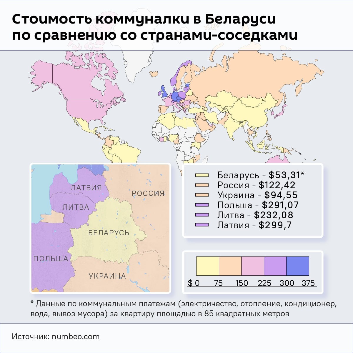 Коммуналка в Беларуси самая дешевая по сравнению с соседними странами Статистический интернет-ресурс Numbeo посчитал расходы на "коммуналку" в среднестатистической квартире площадью 85 квадратных метров. В расчет брались счета за электричество, отопление (а также охлаждение), водоснабжение и вывоз мусора. Всего в рейтинге 123 страны. Наиболее низкая квартплата в Иране — $15,59. Дороже всего в Австрии — $377,07 доллара. Беларусь находится на 98 месте (на первом самая дорогая страна), и "жировка" в типовой квартире тянет на $53,31. Подробности — в нашей инфографике. @SPUTNIKBY