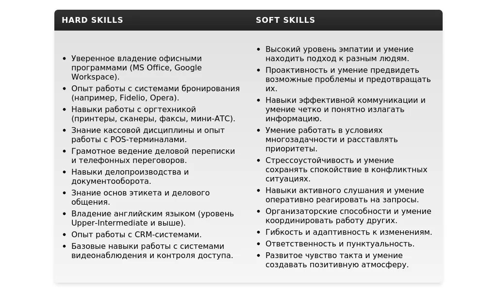 Раздел "Навыки" должен четко и лаконично демонстрировать, что вы обладаете необходимыми компетенциями для успешного выполнения работы администратора рецепции.