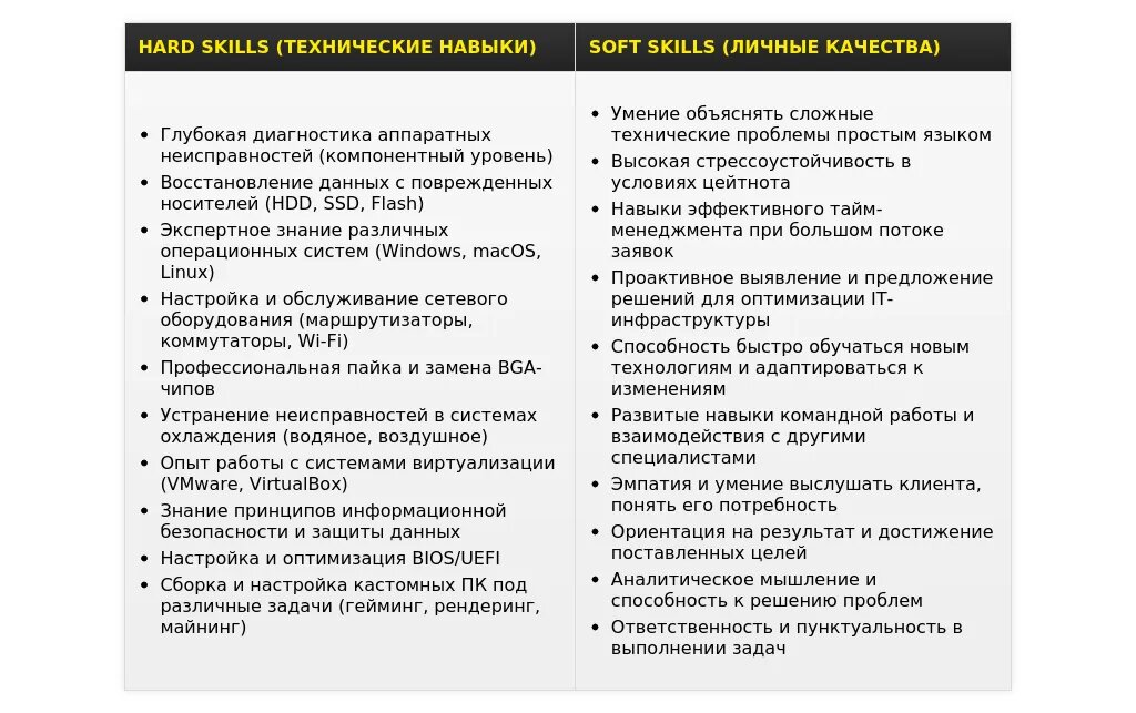 Анализ: В резюме необходимо акцентировать глубокие знания аппаратной и программной части ПК, опыт работы с серверным оборудованием и сетевыми протоколами. Наличие сертификатов и опыта работы с виртуализацией будет большим преимуществом.