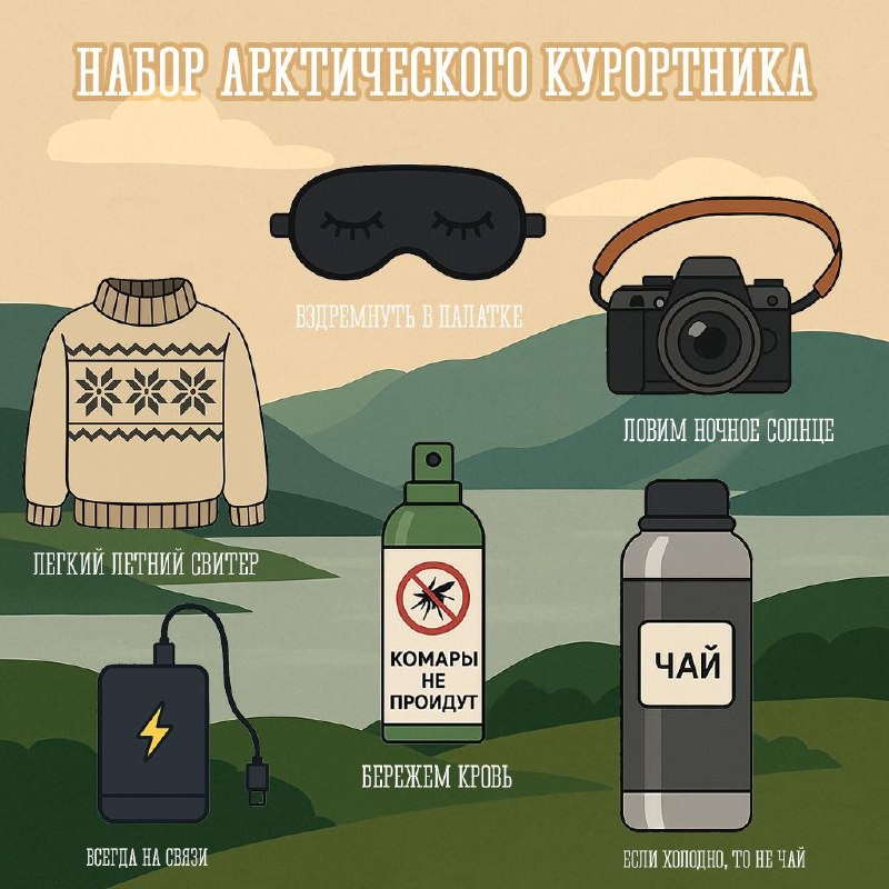 🔥Пришла жара, +20!🔥 Пора открывать летний сезон. Нейросеть составила для вас набор арктического курортника. Чего не хватает? Пишите в комментариях! 👇 🔥 Подпишись на ГМО