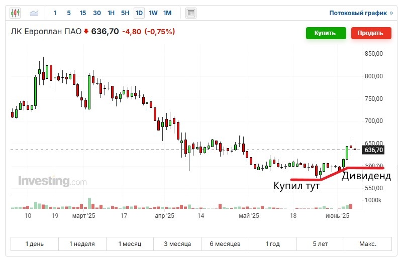 Сегодня опубликовал на основном сайте памятку о том, какие акции покупать в первую очередь, когда падает все, хочется купить много, а бюджет ограничен. Ссылку на нее дам в конце, а пока покажу на собственном примере, как я сделал такой выбор, буквально вот только что, и не прогадал. В конце мая рынок заметно падал, пик падения пришелся на 26-е и 27-е число. В эти дни многие эмитенты в моем портфеле проседали особенно сильно, и можно было бы усреднить полпортфеля, но бюджет был ограничен, приходилось расставлять приоритеты. В первую очередь я выбрал двух важных для меня эмитентов, которые на тот момент заметно проседали, и по которым в ближайшее время предстояла не очень крупная, но существенная дивидендная выплата. В расчете на то, что перед выплатой они успеют обратно вырасти примерно на сумму дивиденда, а затем на отсечке вернутся в цене покупки, и я, фактически, получу дивидендный кешбэк. Этими эмитентами стали Европлан и Новабев. У которых дивидендные отсечки произойдут, соответств
