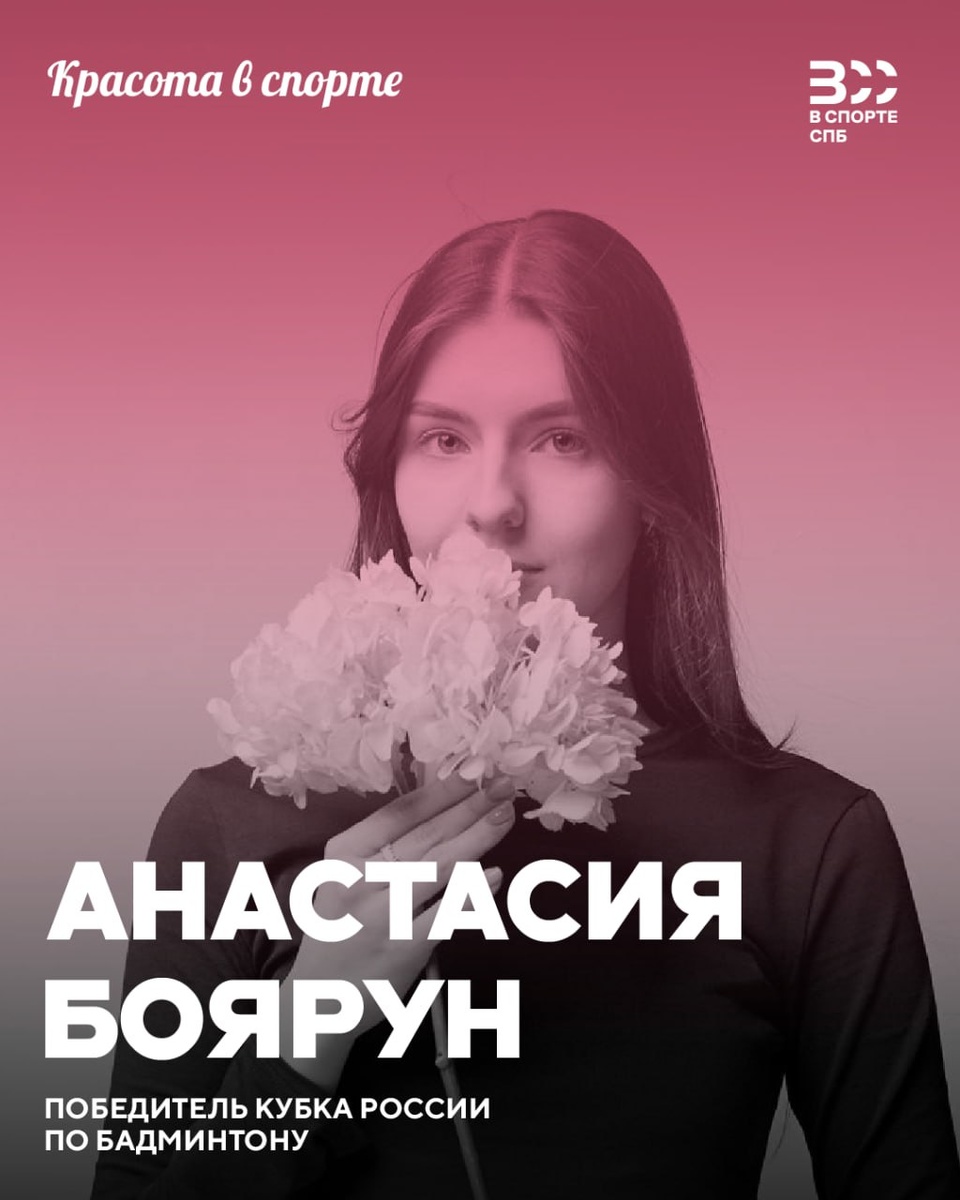 #КрасотаВСпорте ❤️ Знакомимся поближе с прелестной Анастасией Боярун! 🤗 🏸 Анастасия занимается бадминтоном и представляет СШОР «Комета». Наша героиня неоднократно становилась призёром чемпионата России, многократно побеждала и занимала призовые места на всероссийских соревнованиях, а совсем недавно впервые в карьере завоевала золото Кубка России в смешанном парном разряде. Что поднимает тебе настроение? Близкие люди и кофе с очень вкусной булочкой. Какое твое жизненное кредо? Если что-то не получается — делай вид, что это часть плана. Кем ты хотела стать в детстве? Чемпионкой в бадминтоне или программистом. Какие качества ценишь в людях? Доброта, ответственность и искренность. Чего ты больше всего боишься? Темноты и монстров под кроватью. 🙌Будь ВСпорте!