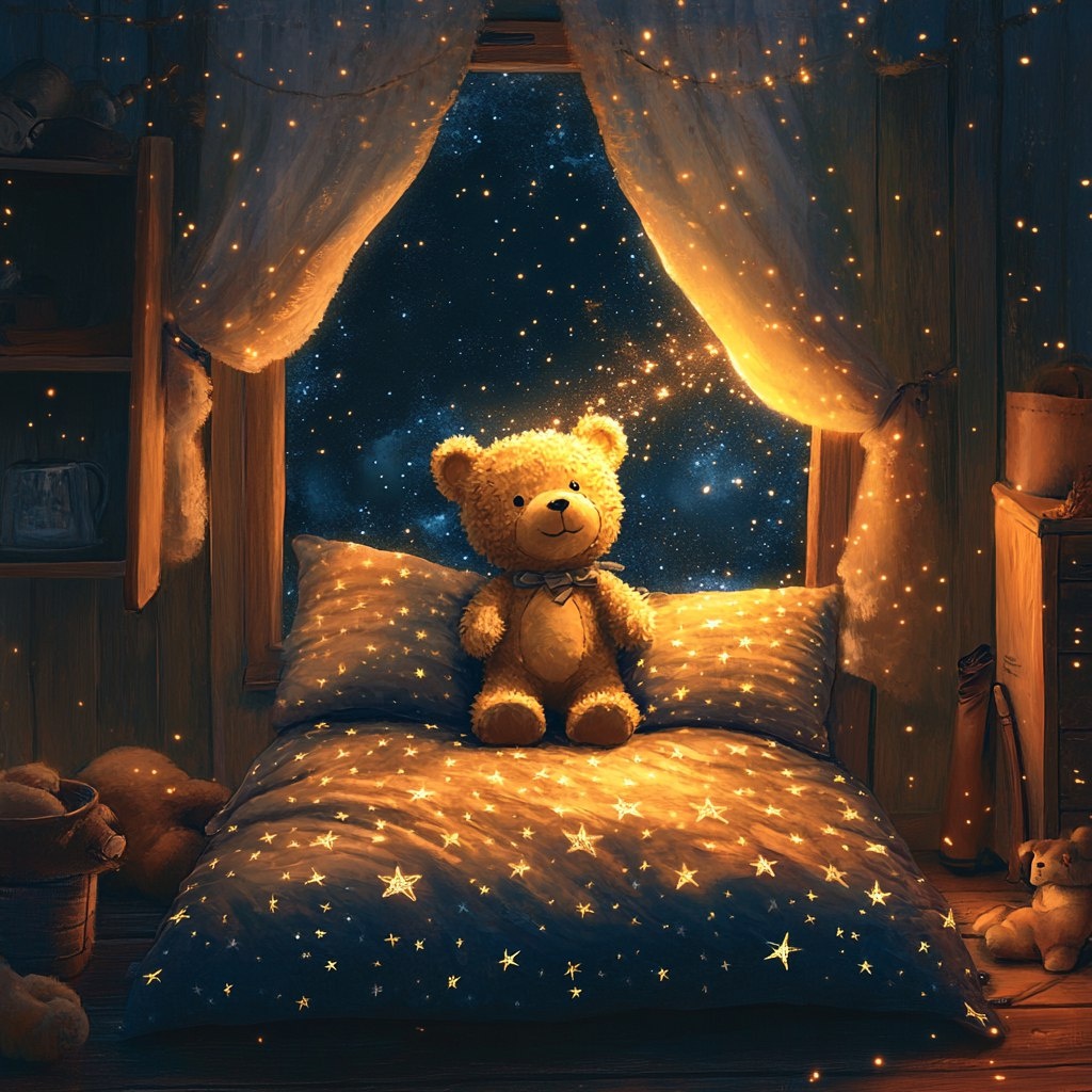 Когда звезда заглядывала в окно, комната Евы наполнялась мягким светом. Всё замирало: книжки на полке, пижамка на стуле, ночник с полусонной луной. В это время просыпался он — плюшевый медвежонок Топа. Его шерстка была карамельной, немного потёртой, а на шее болтался красный шарфик, повязанный Евой в один из зимних вечеров. На спине Топы лежало звёздное одеяло — тёплое, синее, с вшитой золотой нитью. Оно хранило сны. Не просто укрывало, а вплетало в себя воспоминания, мечты, светлые желания. Оно было частью магии, которую чувствуют только дети и игрушки. В ту ночь Топа заметил странное: золотая нить потускнела. Её свечение было еле уловимым, как свет светлячка в банке. Он аккуратно развернул одеяло на подушке и провёл лапкой по ткани. Там, где нить должна была изгибаться в звёздный узор, осталась лишь бледная линия. — О нет, — прошептал Топа. — Без нити сны рассыпятся. Он обернулся в комнате. Всё вокруг было тихо, но тревожно. Игрушки проснулись и смотрели на него — Кукла Марго с выби