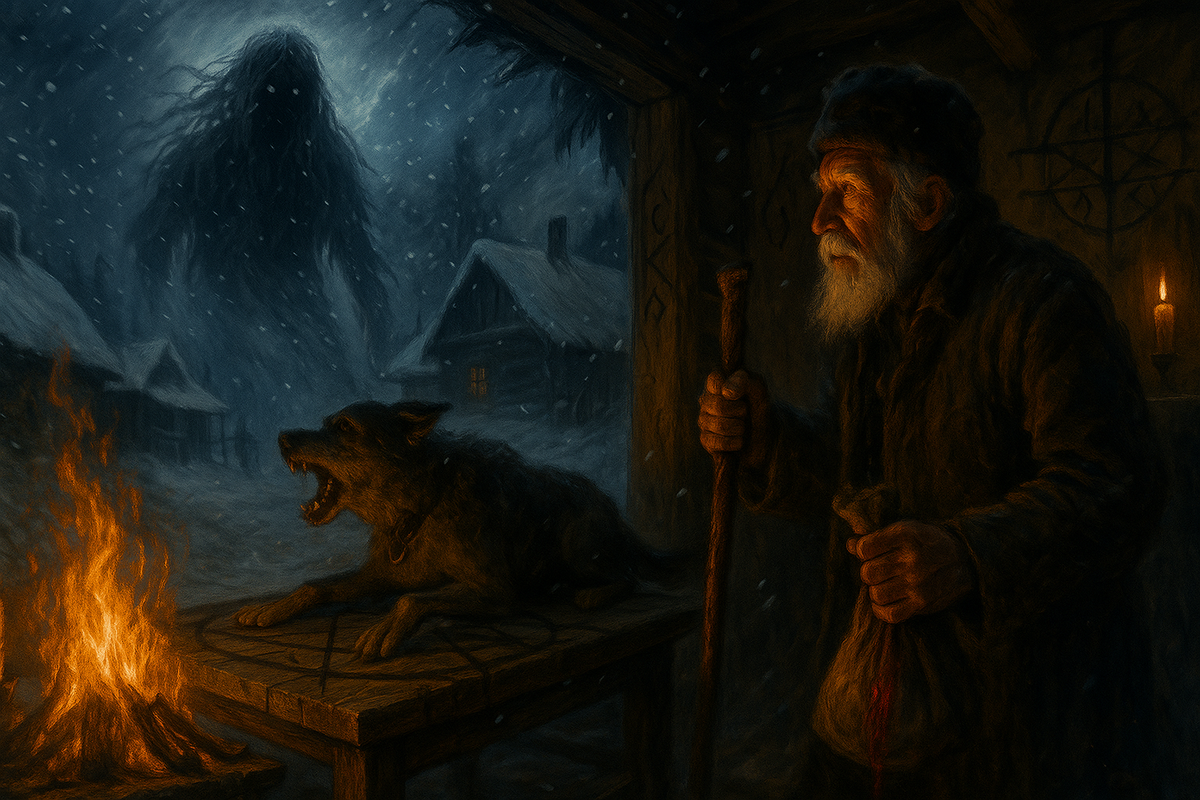 Колдун поднял артефакт — кусок обсидиана, в котором спал язык Западного Равноденствия. Прочитал последнее имя. Пёс прыгнул. Существо взвыло, звук рвал стены, пробивал грудную клетку изнутри. Пламя на рунах вспыхнуло так ярко, что сруб осветился изнутри.