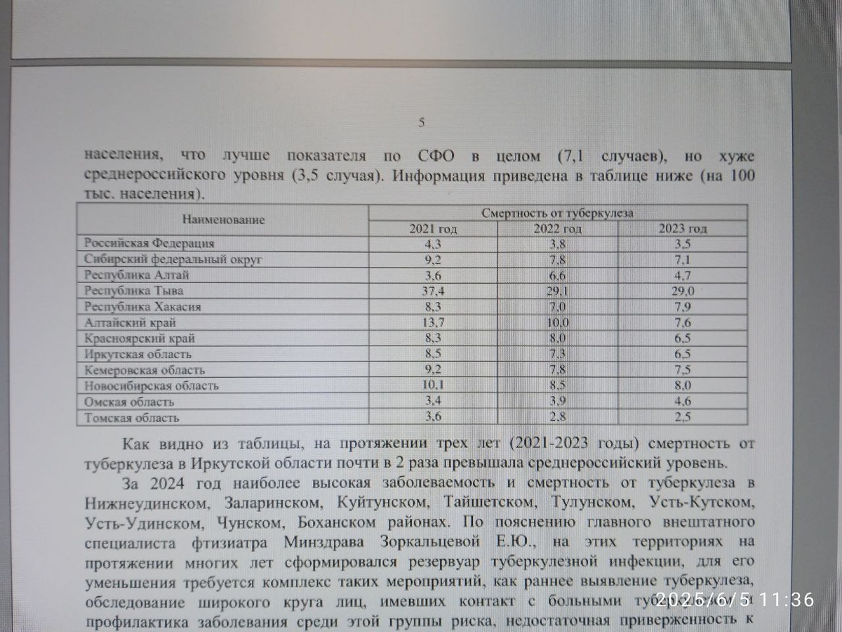 Более 7 смертей (7,1) от туберкулёза на 100 тыс. человек зафиксировано в регионах Сибирского федерального округа в 2023 году. Об этом сказано в отчёте Контрольно-счётной палаты Иркутской области, представленном в местном заксобрании (фотографии опубликовал депутат Анатолий Обухов).