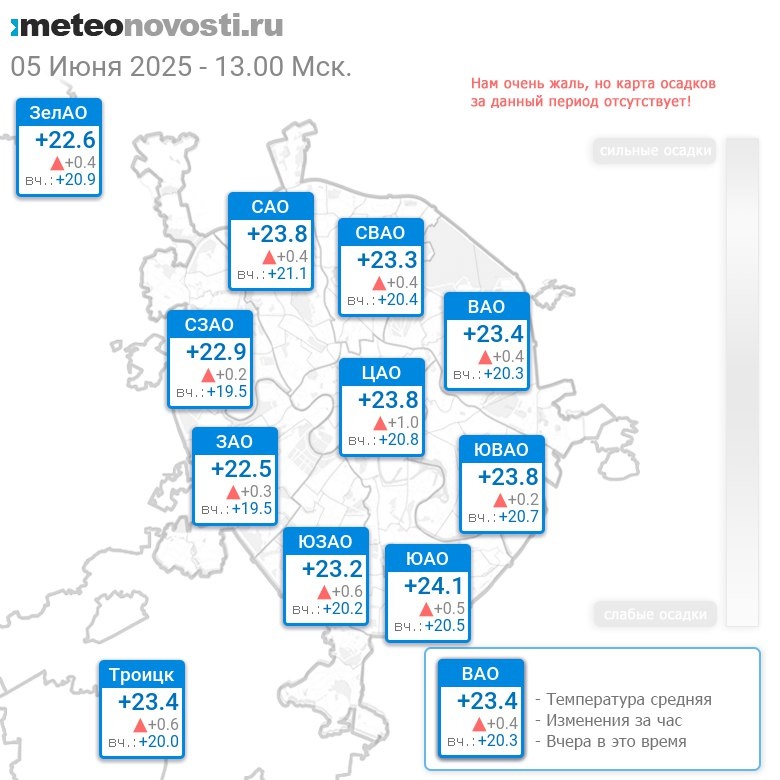 В 13:00 в Москве было от +21.7°C до +25.4°C, средняя температура +23.6°C #погода #Москва #лето #температура #5июня #четверг