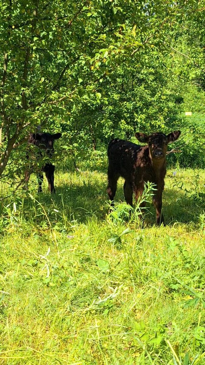 Новорожденные малыши «Природного хозяйства Михайловское» пасутся на сочной молодой траве со своими мамами — чистые и счастливые, имея возможность свободно передвигаться, пить свежую воду и отдыхать от зноя и мошкары в тени деревьев — ровно так, как это задумано природой. С зелёной биркой в ухе — это бычок, с оранжевой — тёлочка. Не перепутайте эти довольные мордочки!