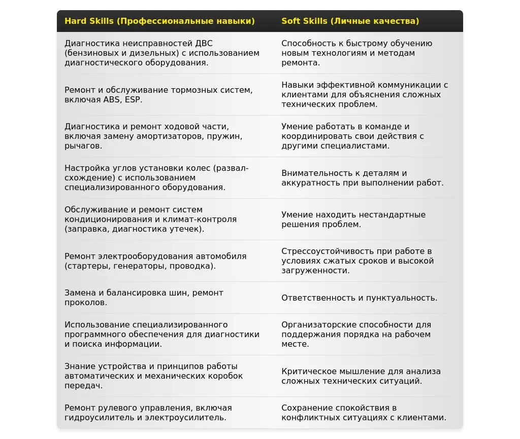 - Навыки: Перечислите свои навыки, сгруппировав их по категориям (например, "Ремонт ходовой части", "Ремонт двигателя", "Диагностика").