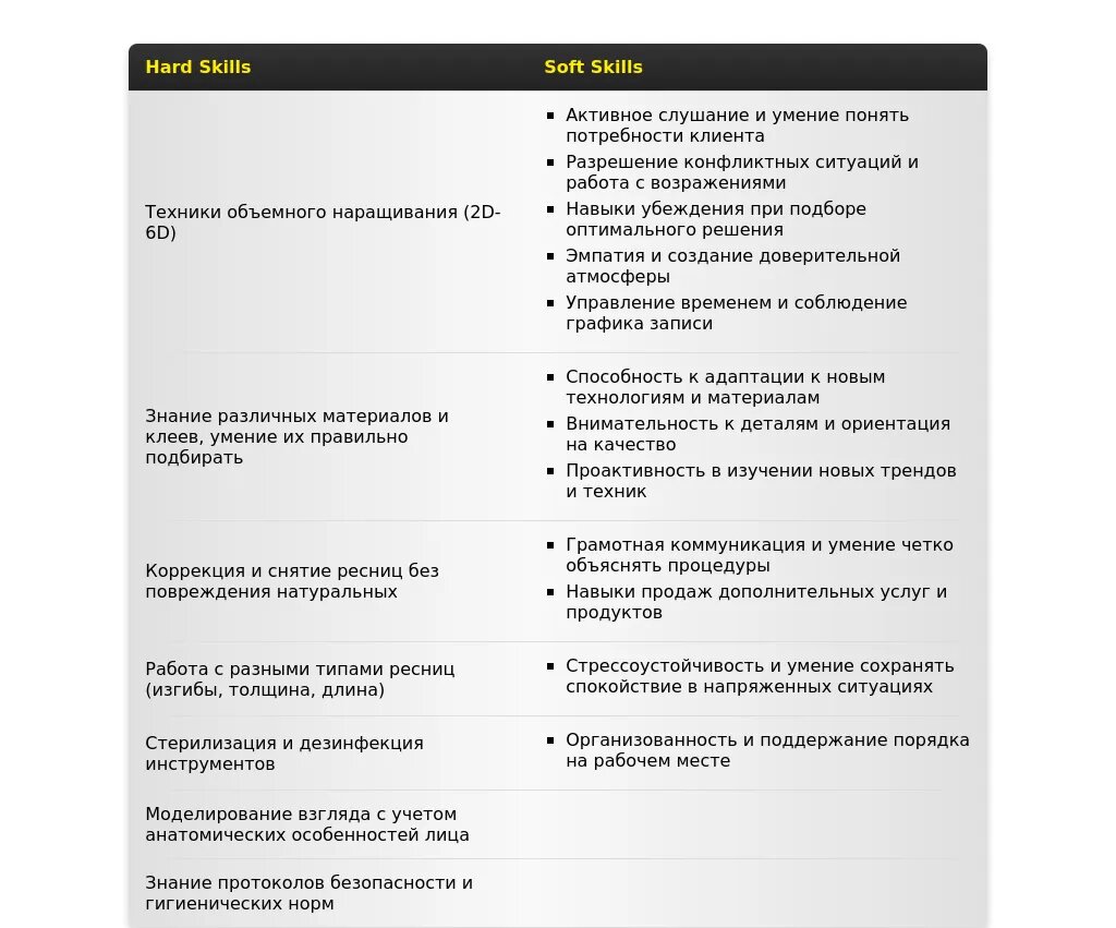 - Для вакансий в студиях наращивания ресниц: "Выполнение сложных дизайнов", "Работа с различными материалами", "Повышение квалификации", "Участие в конкурсах".