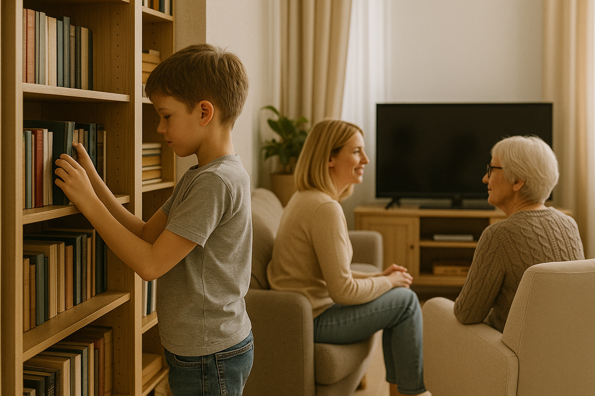 Вечером, когда семья собралась смотреть телевизор, Максим вдруг встал и подошел к книжной полке Анны Петровны. Не глядя на взрослых, он начал аккуратно переставлять книги, группируя их не по размеру или цвету, а по какому-то своему принципу.