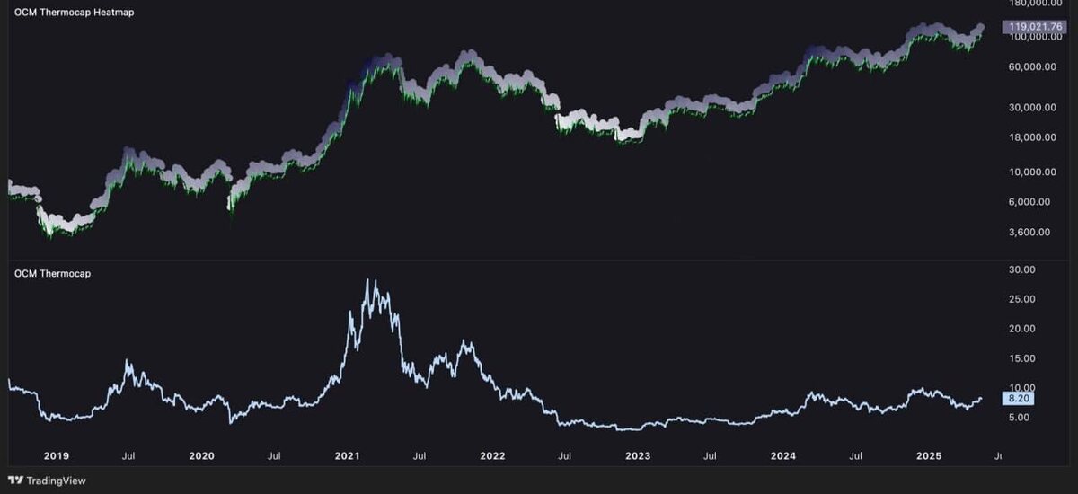 📊 Thermocap: BTC's Got More Gas in the Tank! One key metric we’re keeping an eye on is Thermocap—basically, it’s the total dollars invested in BTC since day one (price × mined coins). To gauge if the market's getting heated, we compare the current market cap to Thermocap. Right now, BTC doesn’t look "stretched" at all by this measure. We're still miles away from those historical highs! 🚀💰