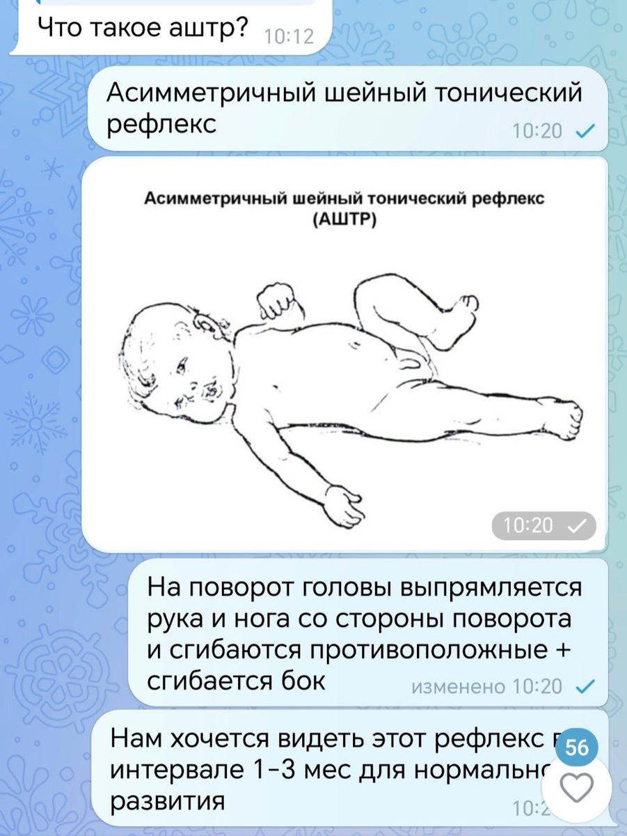 Проверяем малыша до 3 мес в обе стороны. Смотрим реакцию. Если с одной стороны она слабее, то можем использовать предложенную выше технику: фиксируем поворот головы в нужном направлении на 1-2 минуты, 2 раза в день, 5-7 дней. Периодически проверяем АШТР в обе стороны для оценки динамики развития, чтобы вовремя изменить стратегию